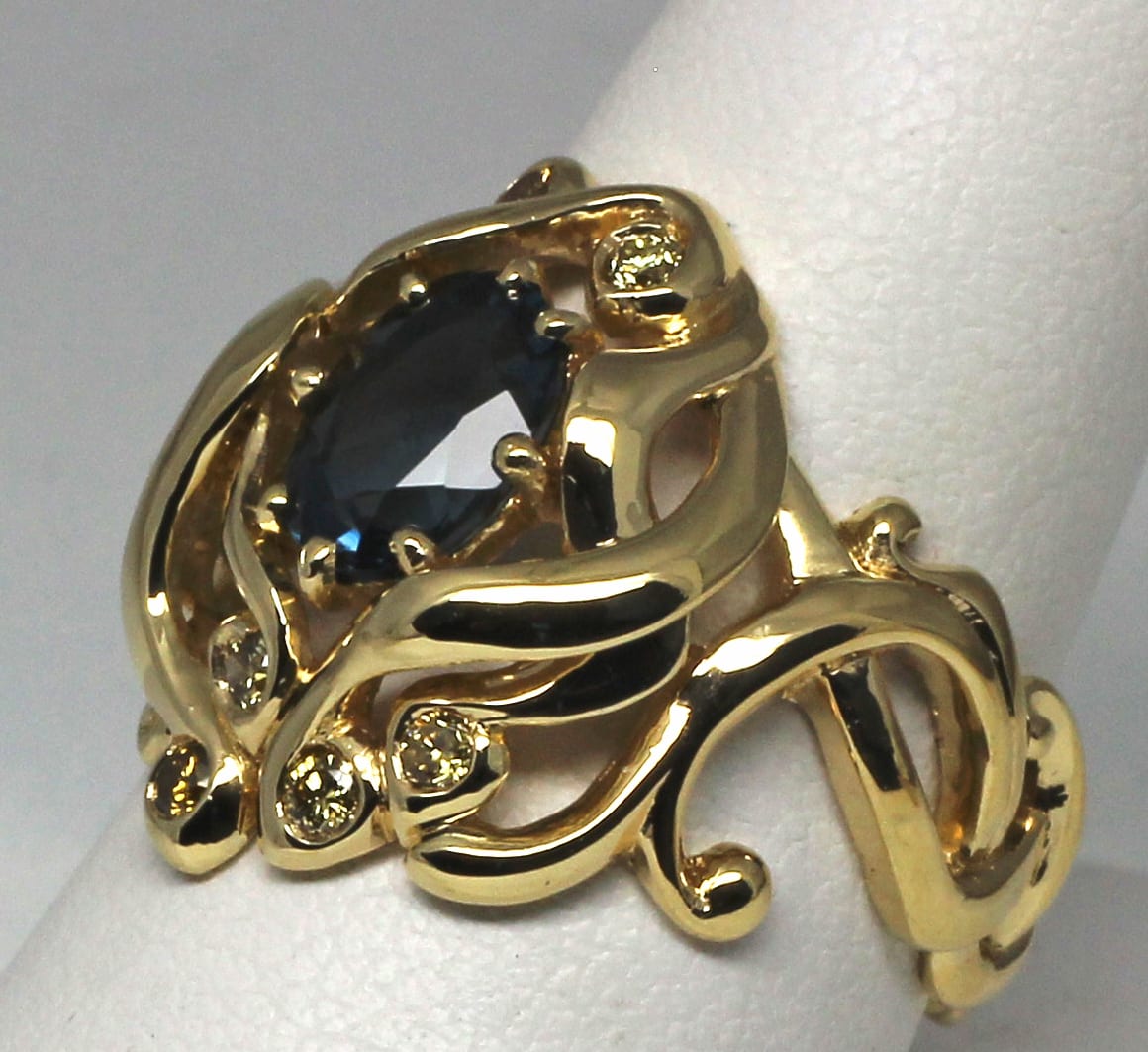 The images of the waxes are all of this custom order. It isn't finished yet so there are no images of that but I have included a few of the same piece with different stones to show how it can morph according to the needs of the commission. https://postgatejewelers.com/product/blue-topaz-celtic-nouveau-ring/Custom orders normally take about 6 months or less. Some very complicated ones may take a few years.