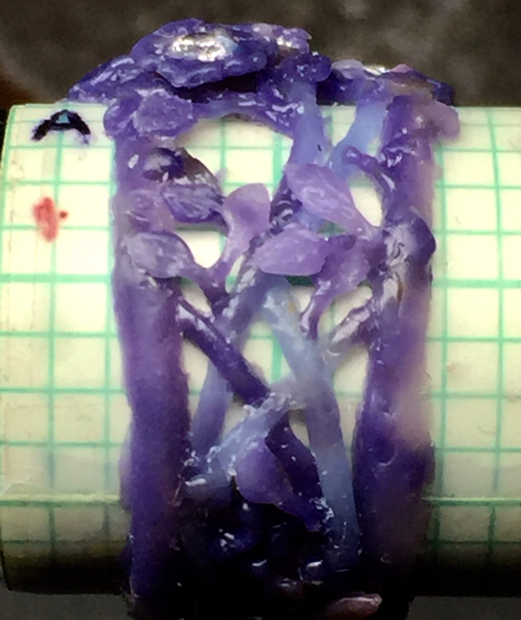 I've wrapped graph paper around the mandrel to shim it to the right size. The paper also gives me a guide, to help me shape and detail the wax. I've used wax wires to create the vines and I have started making the leaves. You can see how the details are very rough and undefined. I'll move things around until I feel that the vines are starting to look natural and alive.