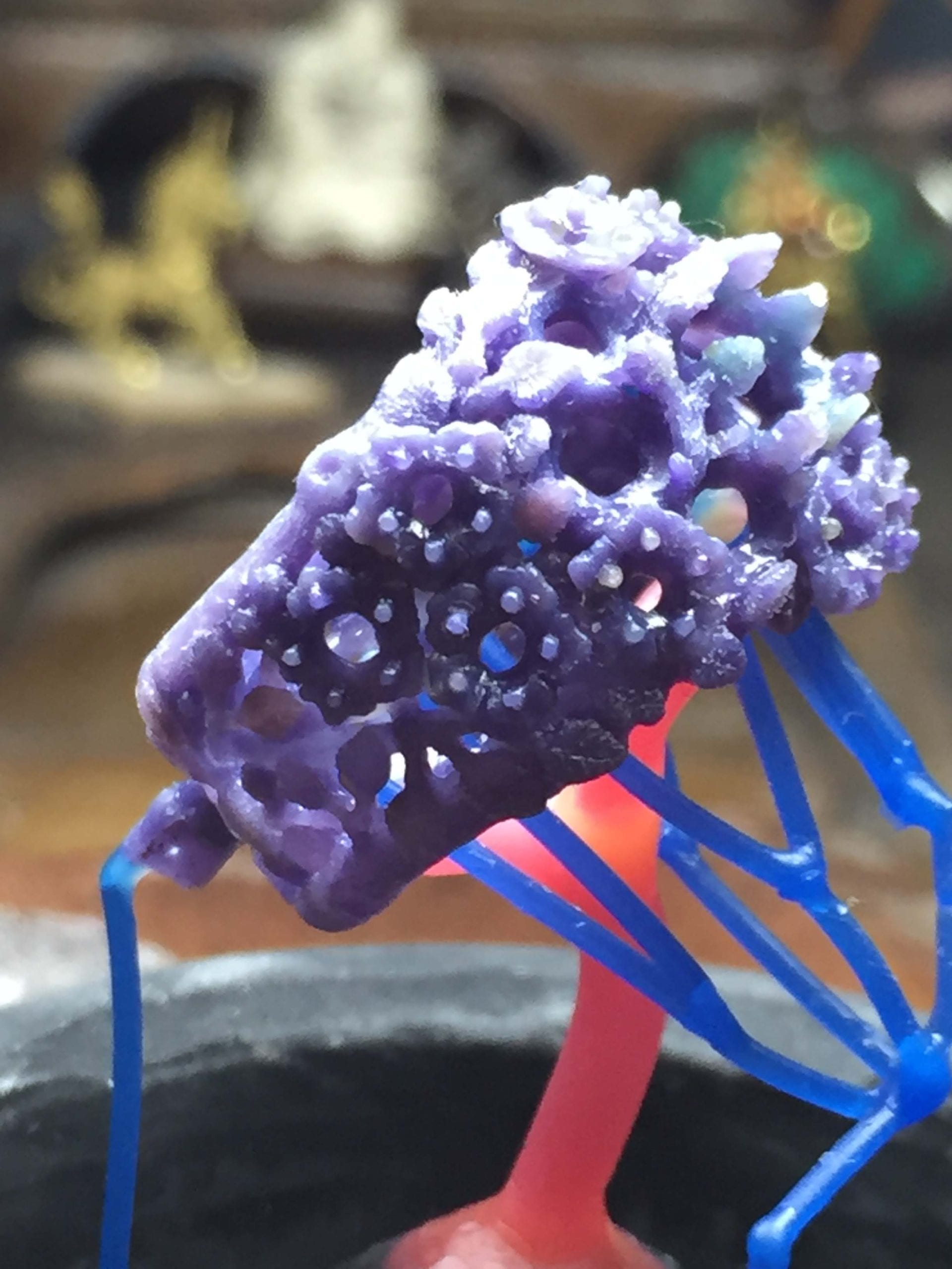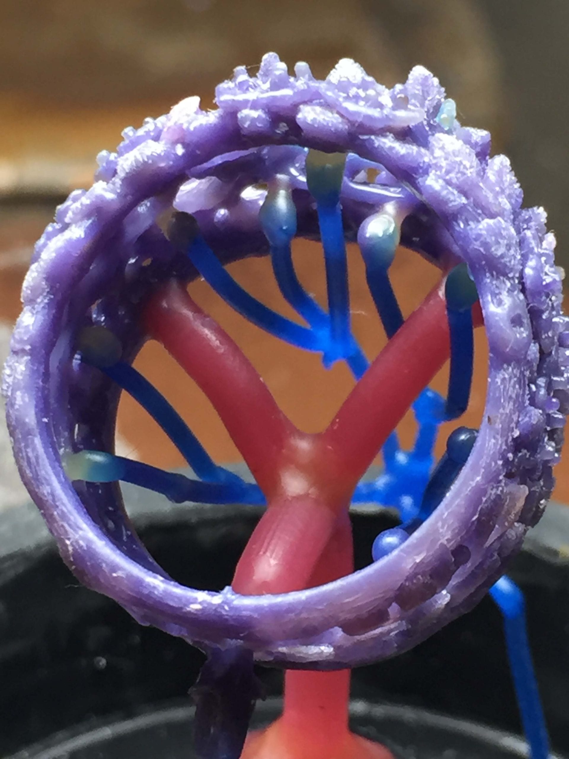 The blue thin wax wires are vents. Once the wax has been burned out, the plaster is porous enough for the atmosphere within to be pushed through it as the metal enters. This means that vents aren't always needed. I've used the vents to make sure that gold fills even the thinnest details. They also help improve the metal's density. I've joined the vents together into one on either side to help the escaping gases to leave the mold.