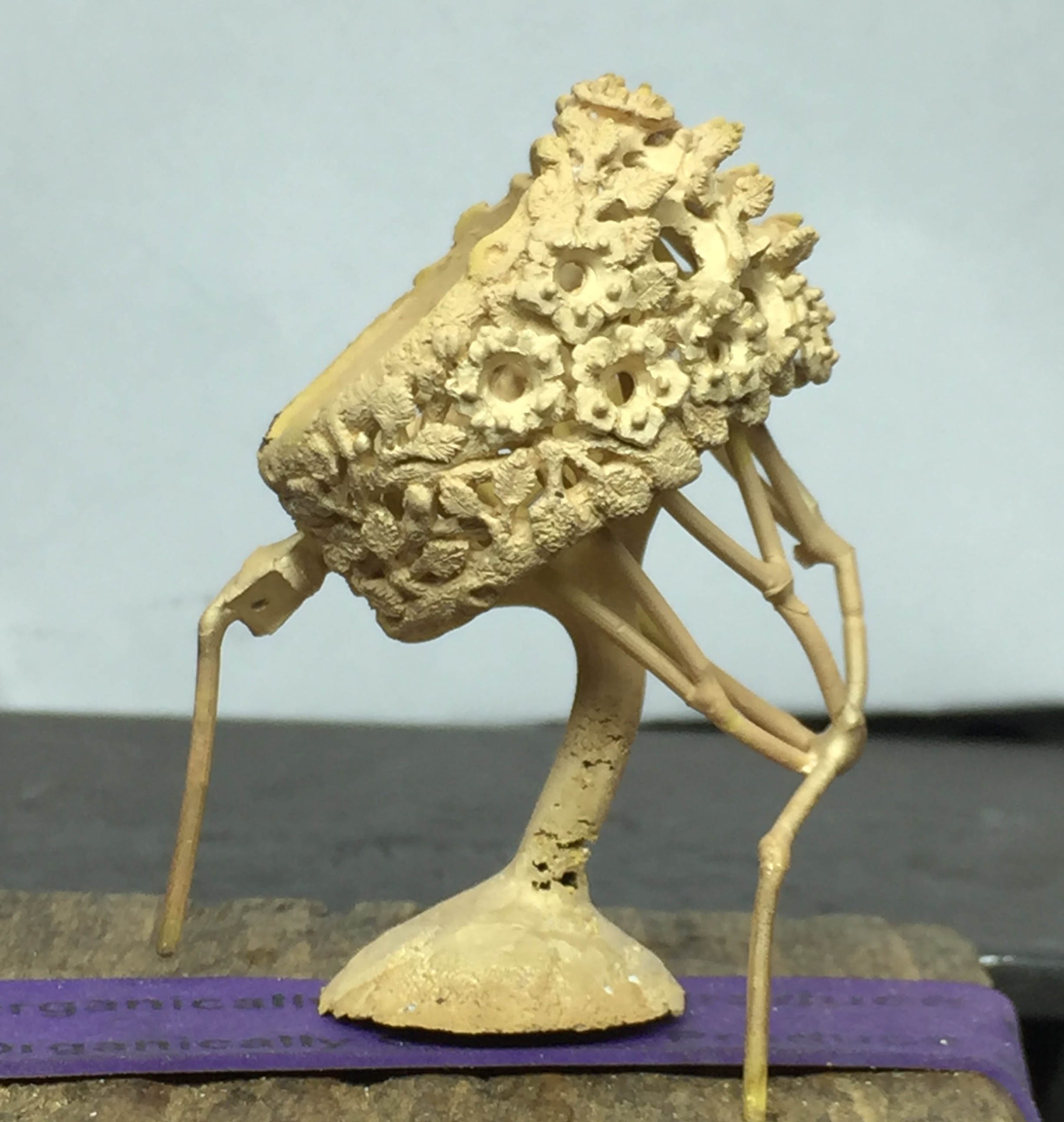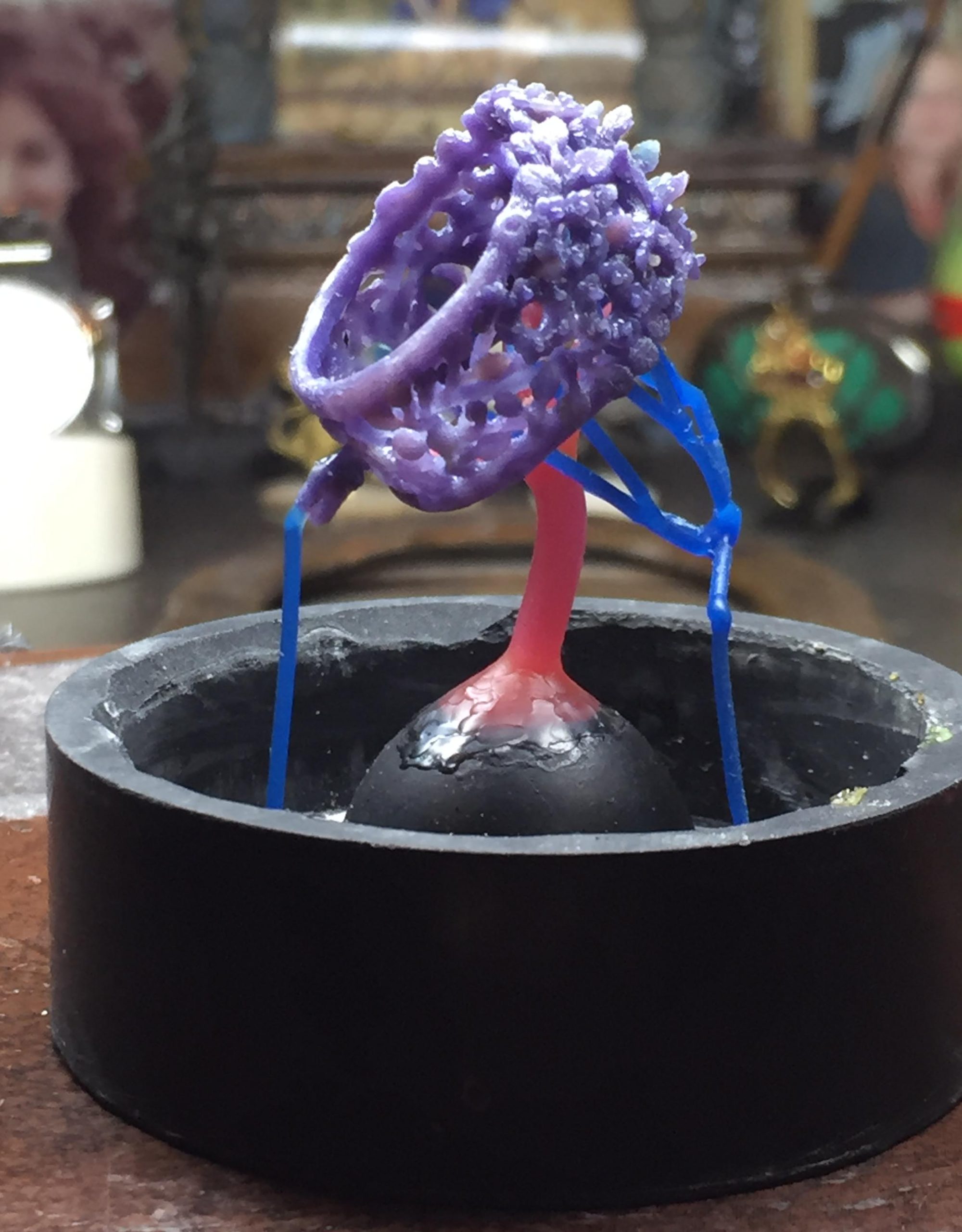 The third image shows the wax attached to the sprue base. The base is made of rubber. It has a conical shaped form in its center that the sprue is attached to. This will form a funnel shaped depression in the center of the plaster mold through which the metal will enter. The vents exit on either side of the funnel.