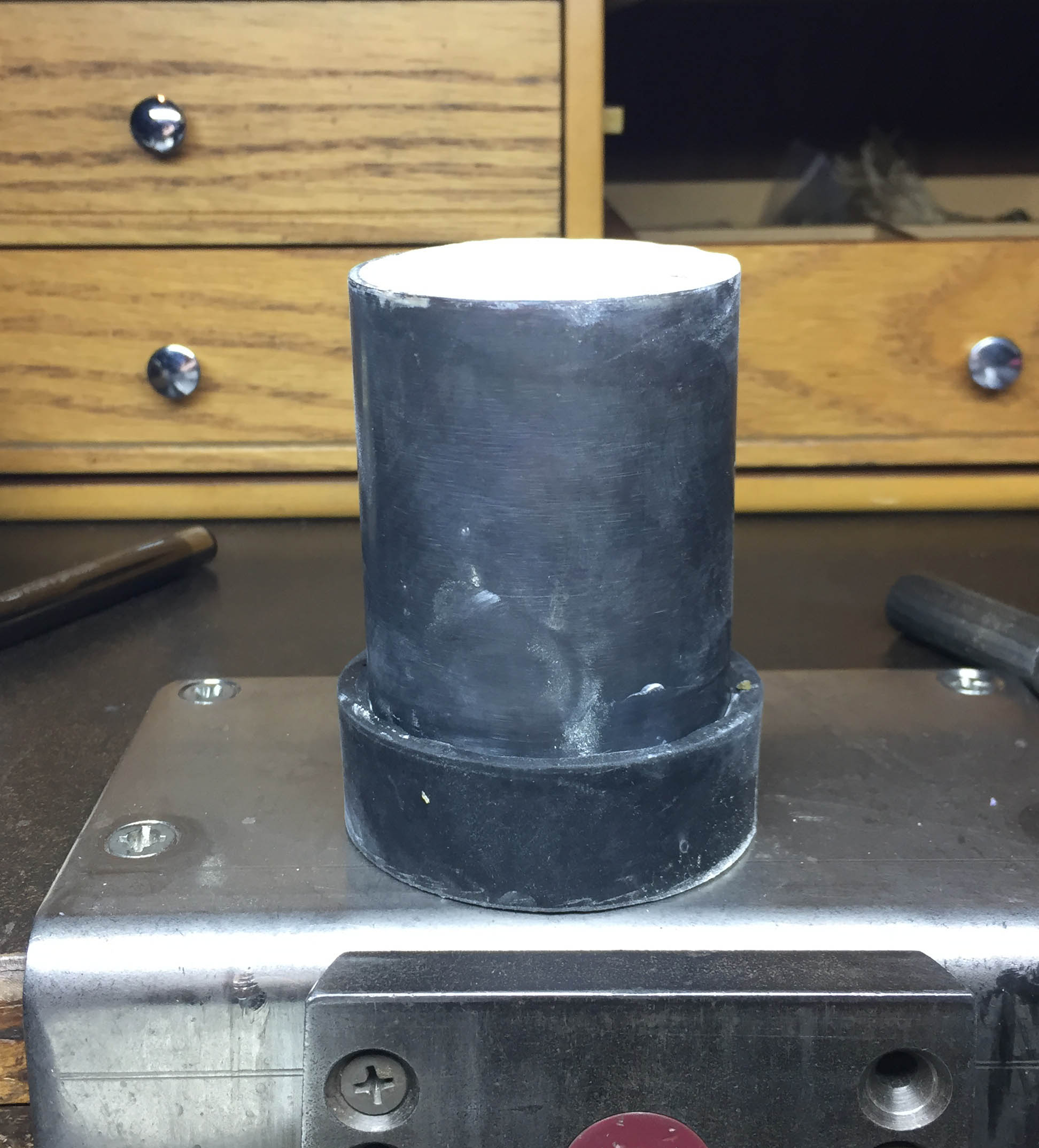The fourth image shows the flask that covers the wax in and fits into the rubber base. The flask has been filled with plaster which now encases the wax. I've left out the investing of the flask, so I will try to explain here. If you look at a straw in liquid, you'll notice that it is covered with tiny bubbles. The same happens to a wax when it is covered with plaster. These bubbles will become trapped in the plaster and become part of the casting. They will cover your piece with solid metal spheres that you will have to remove. This can be avoided by placing the flask into a vacuum chamber while the plaster is still liquid. The flask is placed under vacuum and those small bubbles become so large that they burst out of the plaster. any remaining bubbles become so small that they can't be seen once the vacuum is released.
