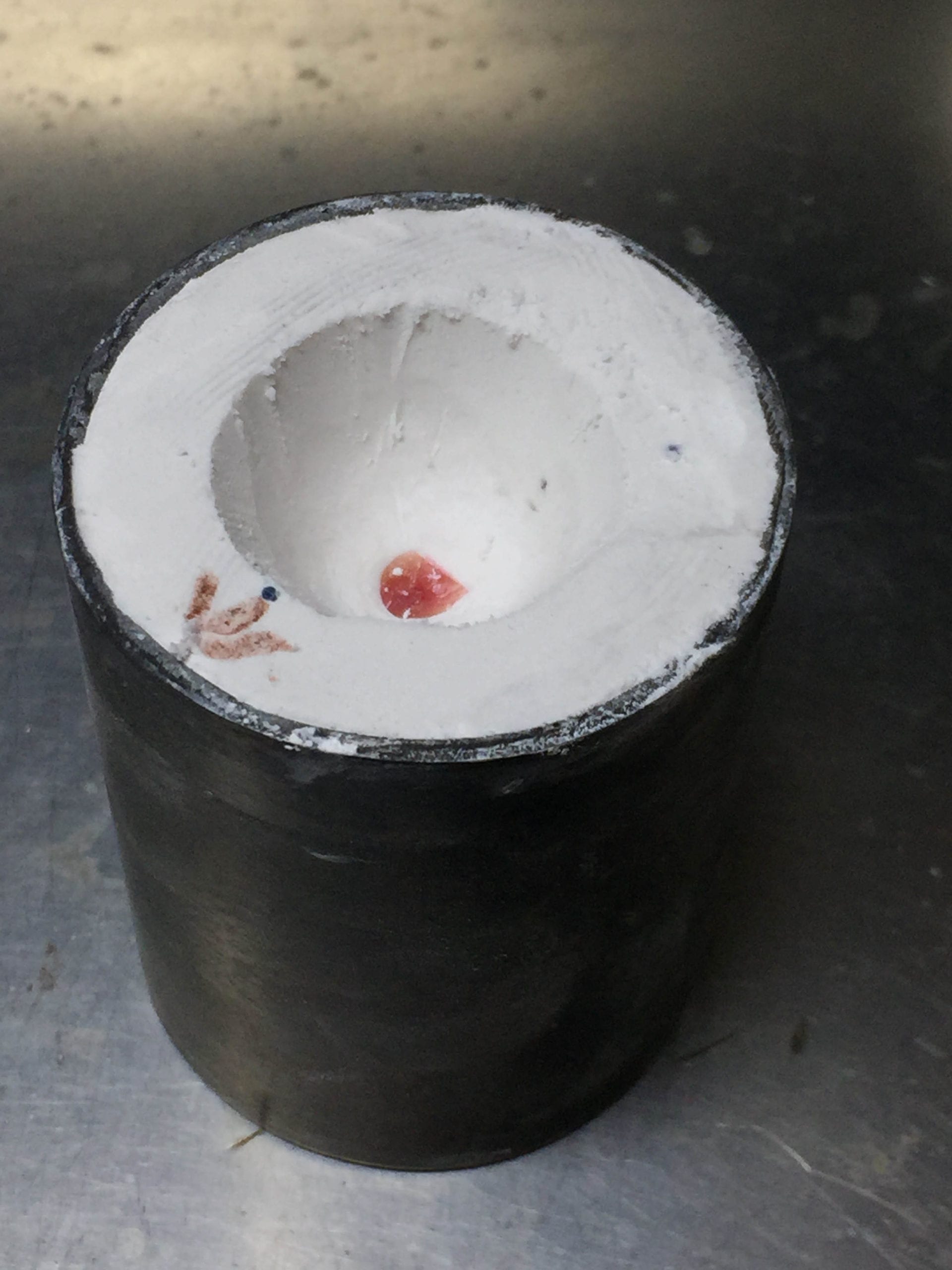 The next four image shows the "business end" of the flask and see the funnel opening for the gold. If you look closely you can see the two tiny ends of the vents, one just above the red mark. That mark shows where the heaviest part of the ring is. I can use it to position the flask so that it will fill best.