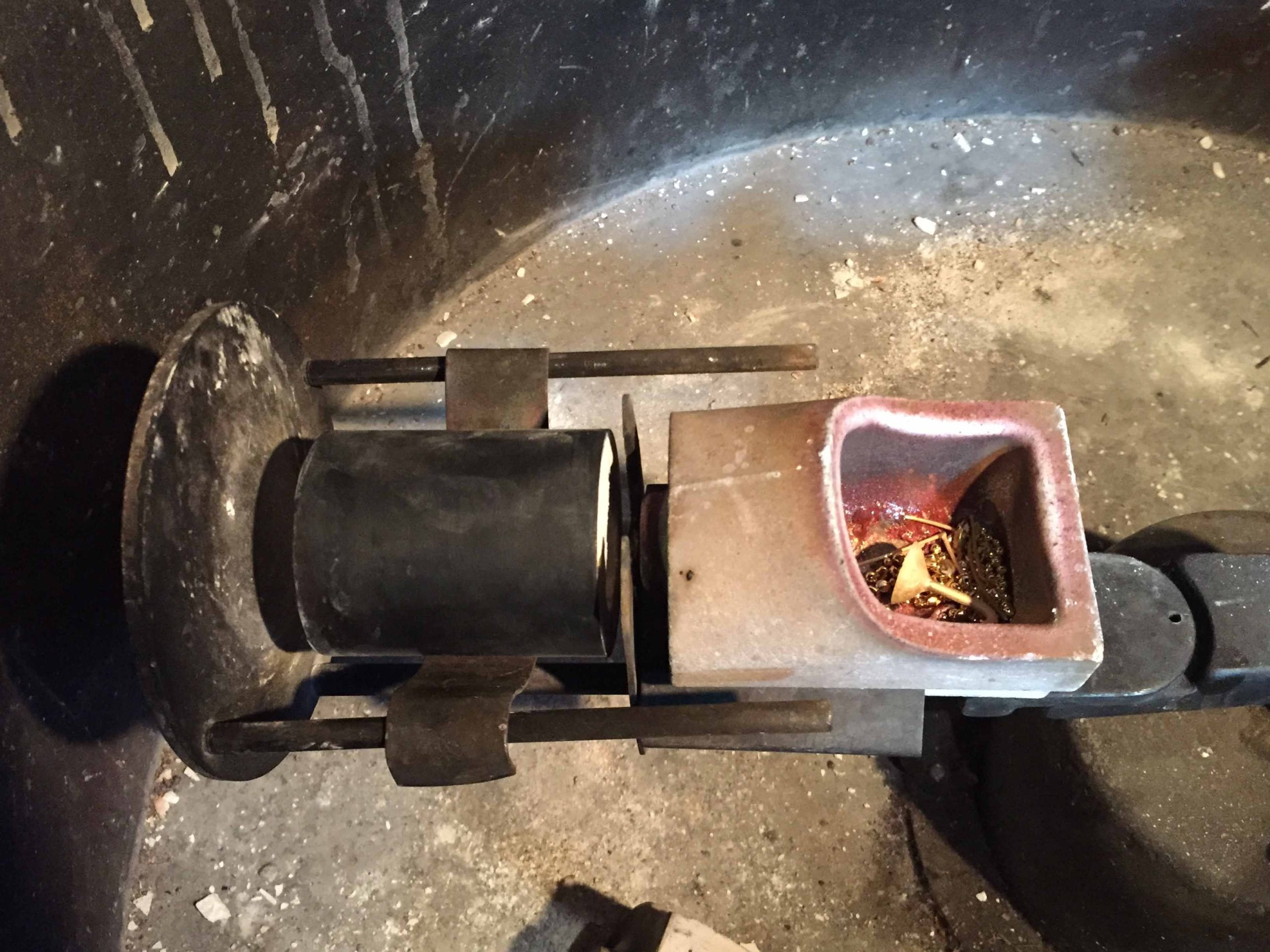 The fourth image shows the flask in the burn out oven where it has been soaked in 1350 degrees F for several hours to vaporize the wax. Wax isn't the only thing that can be burnt out and cast this way. most plastics, wood, and even insects and spiders, can be burned out and cast in metal this way.