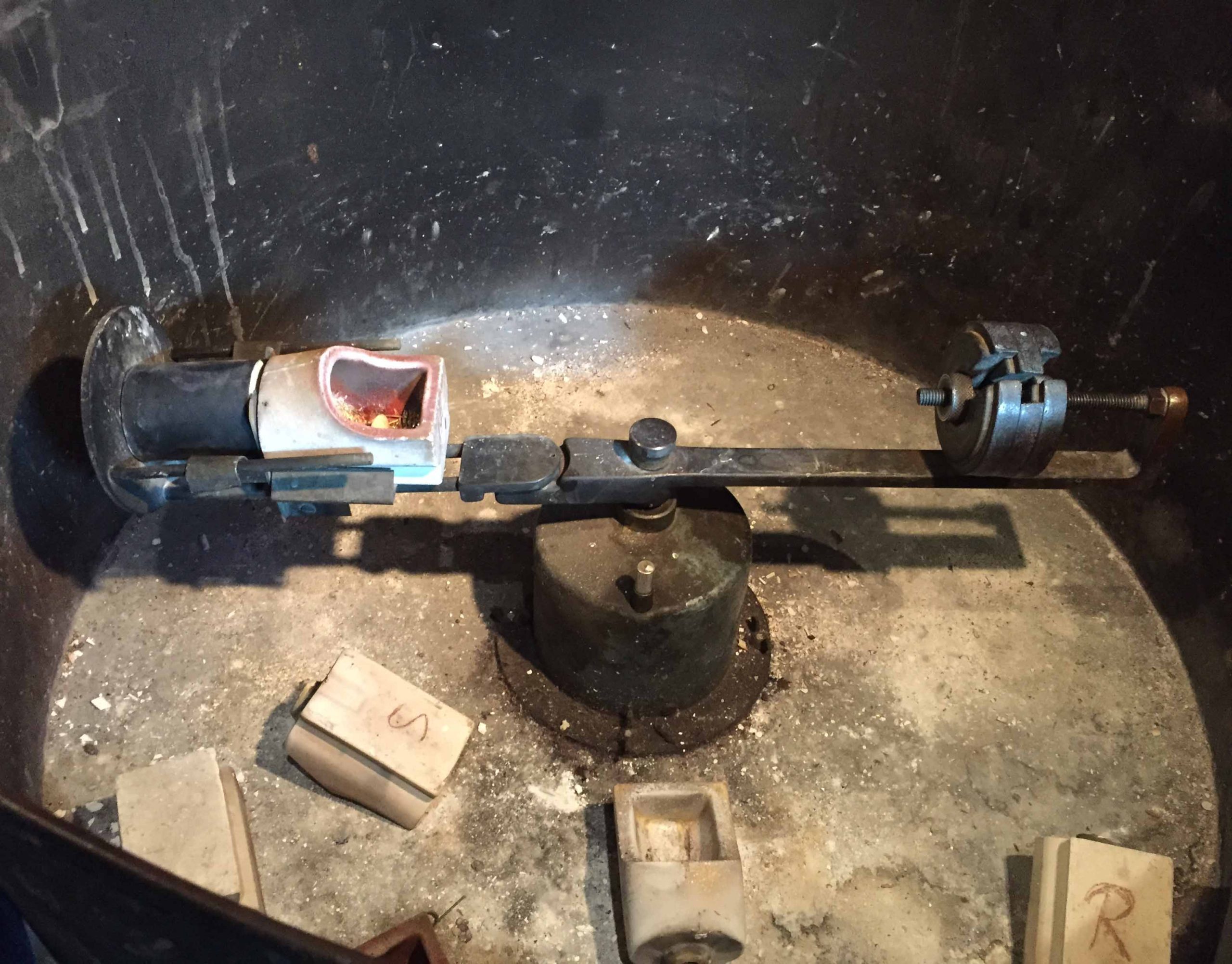 The third image shows the casting machine's arm fully. There are adjustable weights on its opposite end to counter balance the flask and metal. The arm is hinged so the flask can be positioned in line with the movement of the arm as it begins to spin. The arm is attached to a spring that provides the power to make the arm spin. I've posted a video of this flask being cast on Facebook for you to see. Just follow this link. I've also posted the quenching of the flask: https://www.facebook.com/111540785537658/videos/1138178163362599
