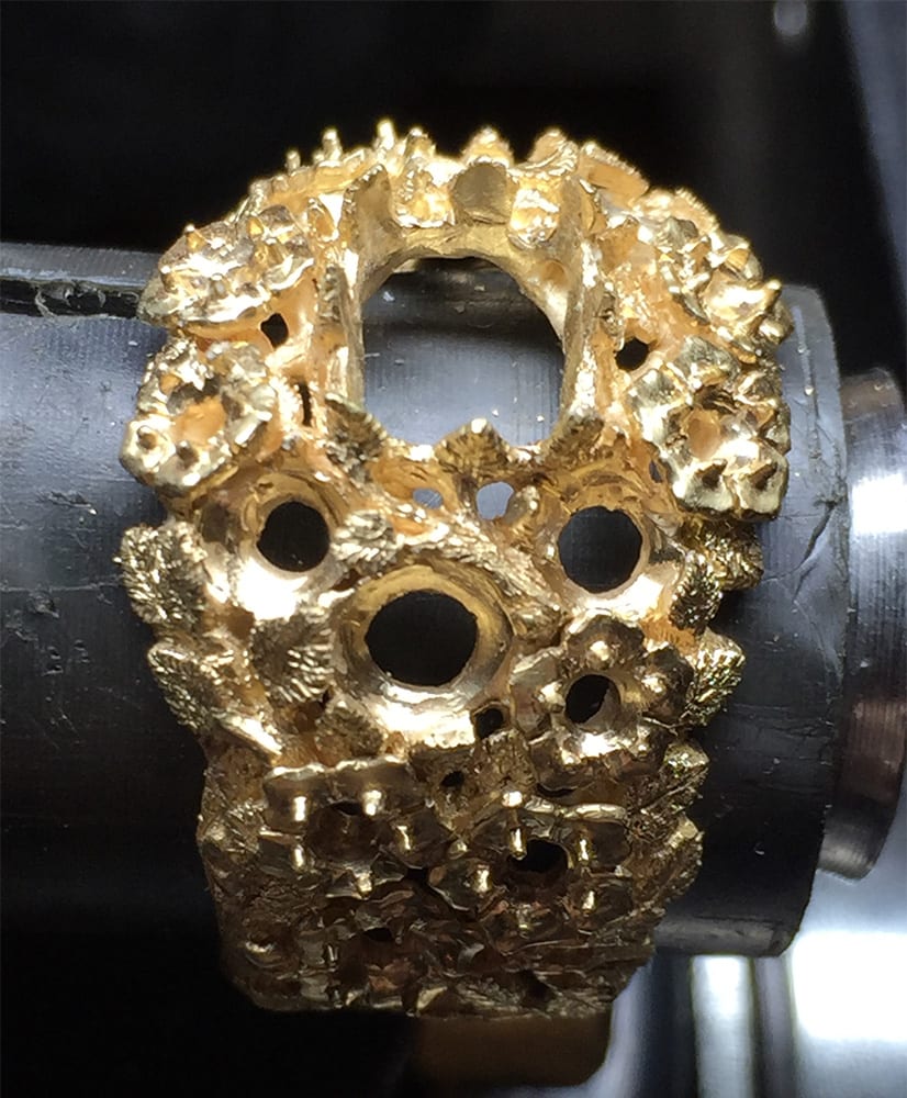 The third image shows a couple of the diamond centered flowers tacked in place to find their best positions. I will remove and replace them several times to get their positions right. This also allows me to detail the vines and leaves that they will partially cover. I want to give the flowers and vines a three dimensional and natural appearance without making the sides of the ring stand out too much.