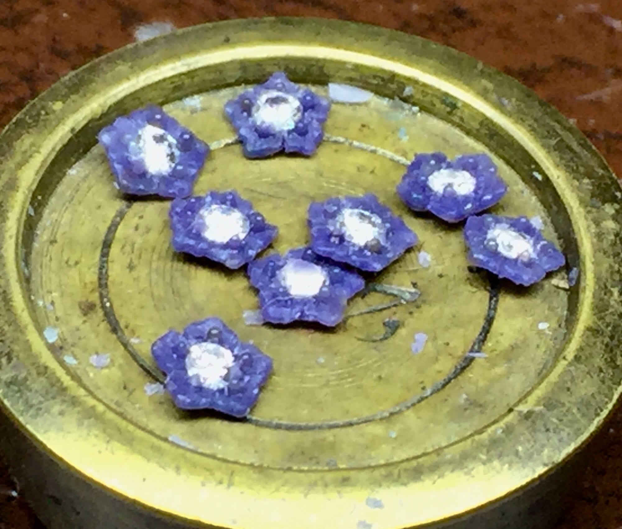 The second image shows the flowers that I made for the ring waiting to be placed in the wax. They were made part of the wax model at first, so that I would know how big to make them. I then cut them off and improved their detailing. It is easy to do more damage than good when working on waxes because the heat from your fingers softens it. Any careless touch can remove the details you've worked hard to create. A wooden stick attached to the waxes allows me to carve and detail them and not touch them too often.