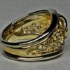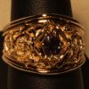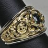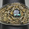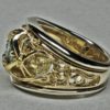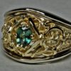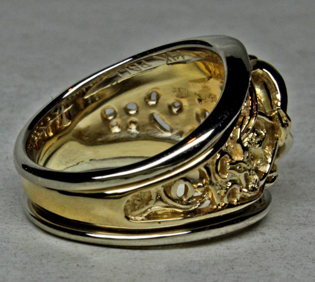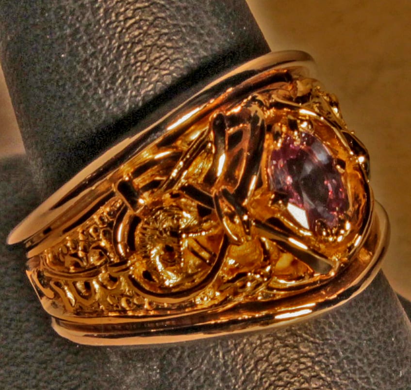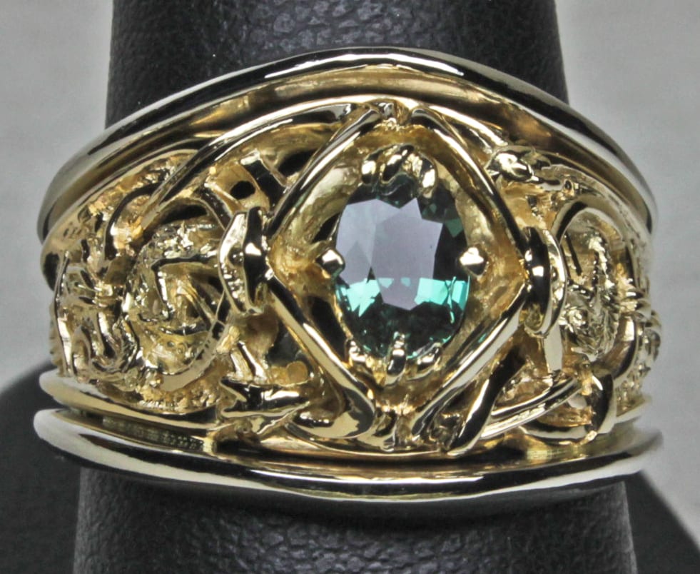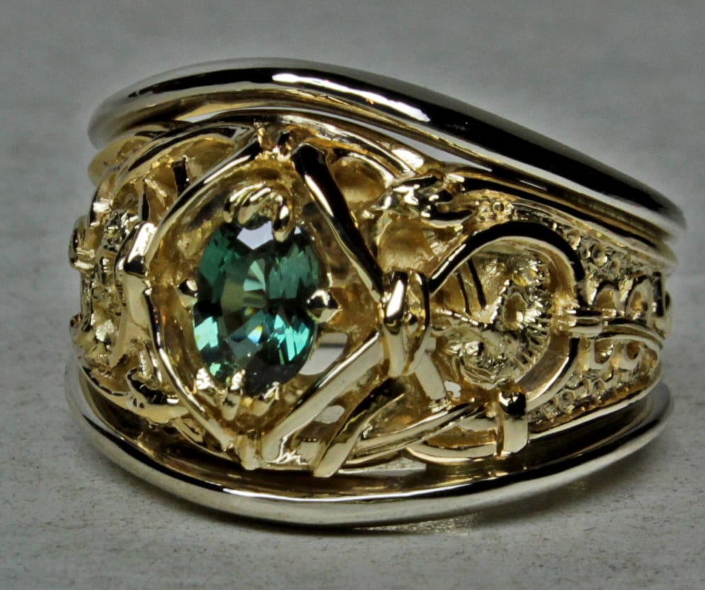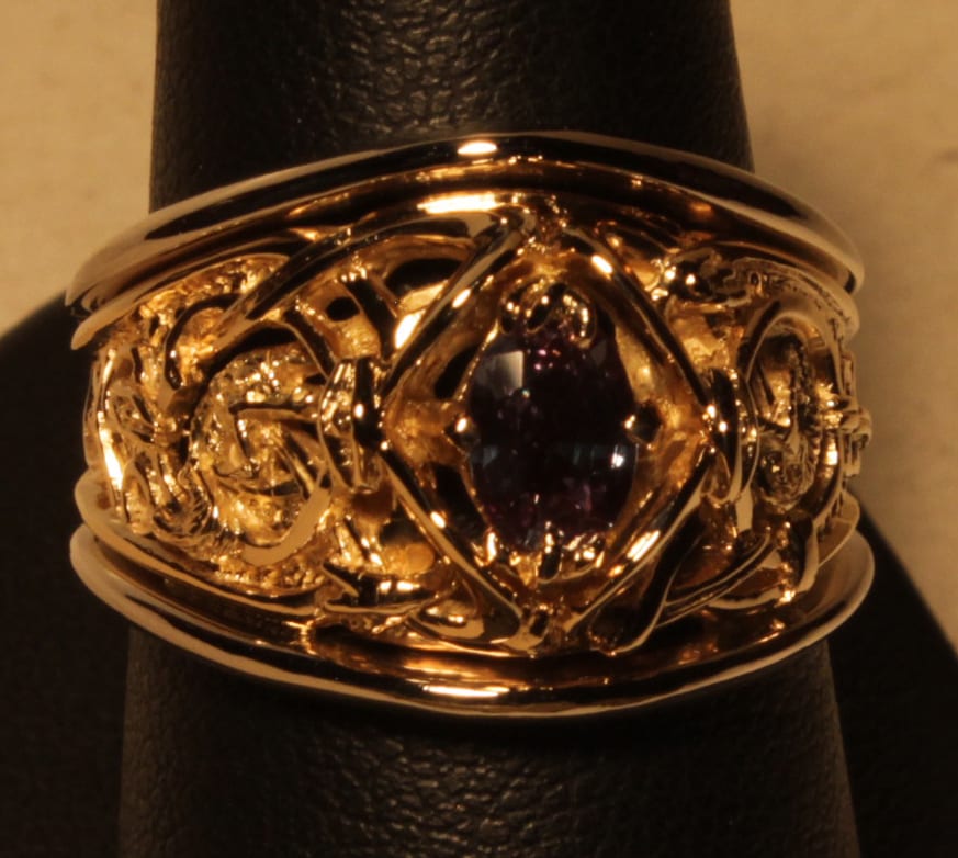 The center portion of the ring is a garland of linked gripping beasts. They were sculpted first in wax and then in the metal, after being cast in18K yellow gold. The sides of the ring give contrast, and some protection to the details and setting in the ring’s center. They are made of 14K palladium white gold. This alloy is the same color throughout and never needs plating. This alloy will not harm persons with nickle allergies. Nickle is the alloy used in most other white gold alloys. To learn more about palladium white gold and why it is much better than common white gold please click here: http://technical-articles.hooverandstrong.com/wordpress/do-chemicals-affect-your-gold/ The center stone is a very rare natural alexandrite. The stone has very good clarity as well as a strong color change, going from a pleasing medium green to a medium purple. The stone weighs 0.58 cts