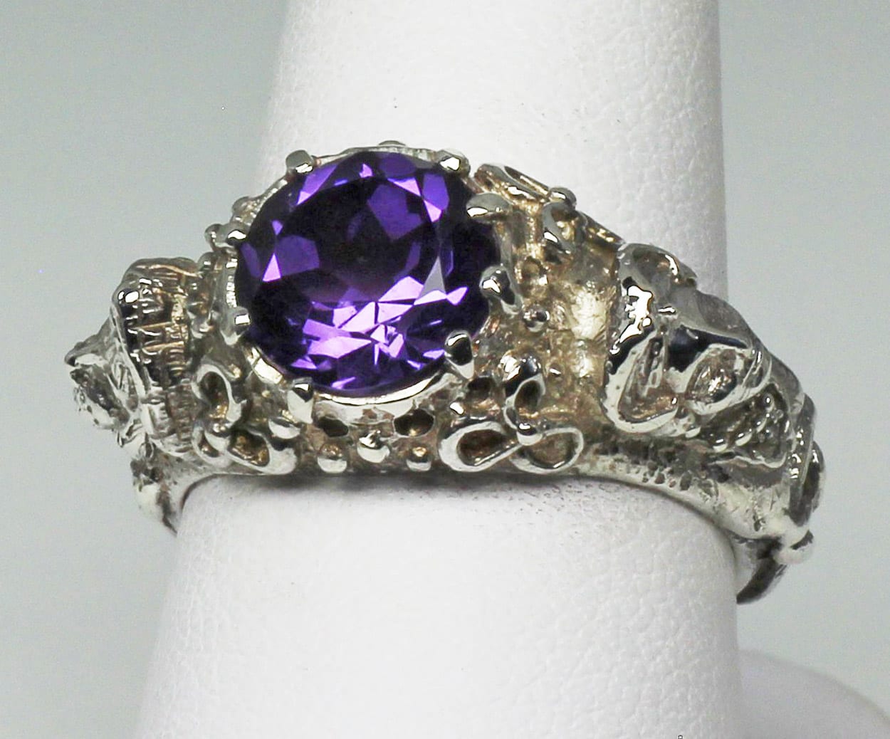 This ring was made by sculpting the design in wax by hand and then casting it in Sterling silver ans setting a fine natural brilliant cut 8 mm amethyst in it. The ring is a size 7. If you would like to learn more about how we make our jewelry please follow this link: https://postgatejewelers.com/waxes/