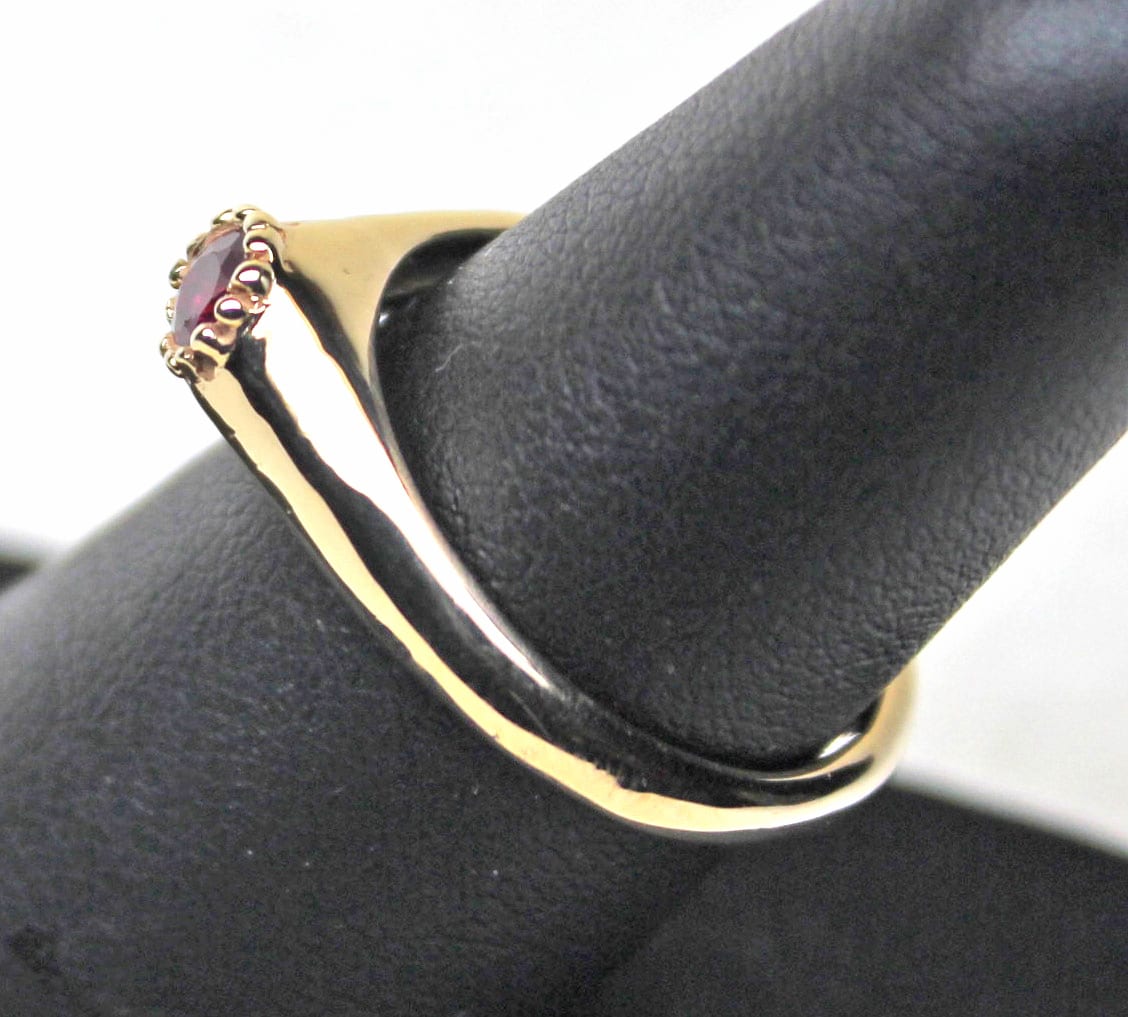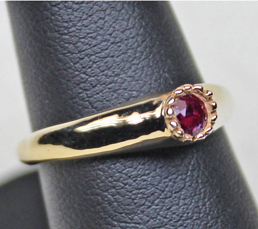 The ring looks very modern, or does it look medieval? The design is actually timeless. A natural faceted 3mm ruby brilliant is set into the ring’s raised center. The ring may be ordered in other karats and colors of golds as well as in sterling silver with your choice of gemstone, prices will vary. Just let us know your ring size and the metal of your choice. Check out some of our other designs here: https://postgatejewelers.com/womans-rings/ Delivery: Three to six weeks depending upon our schedule. We have a wide selection of our work on FaceBook. Some pieces are shown in various stages of completion. When we do a special piece for a customer we often send them image of waxes. This makes it easier for them to understand what we are doing. It also allows us to work together and insure the creation of something special: https://www.facebook.com/Postgate-Fine-Jewelers-111540785537658/photos/?view_public_for=111540785537658&ref=page_internalAncient Roman style ring Details:
