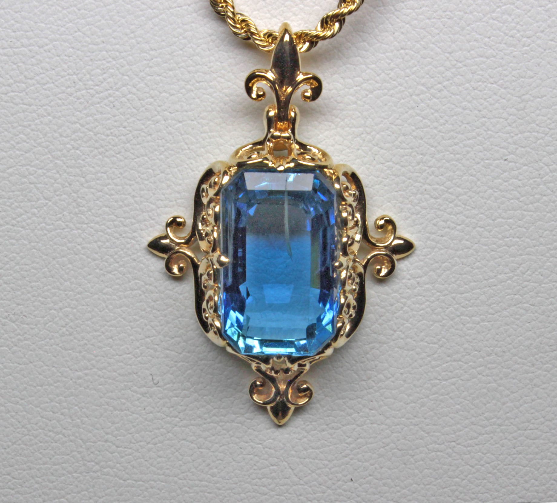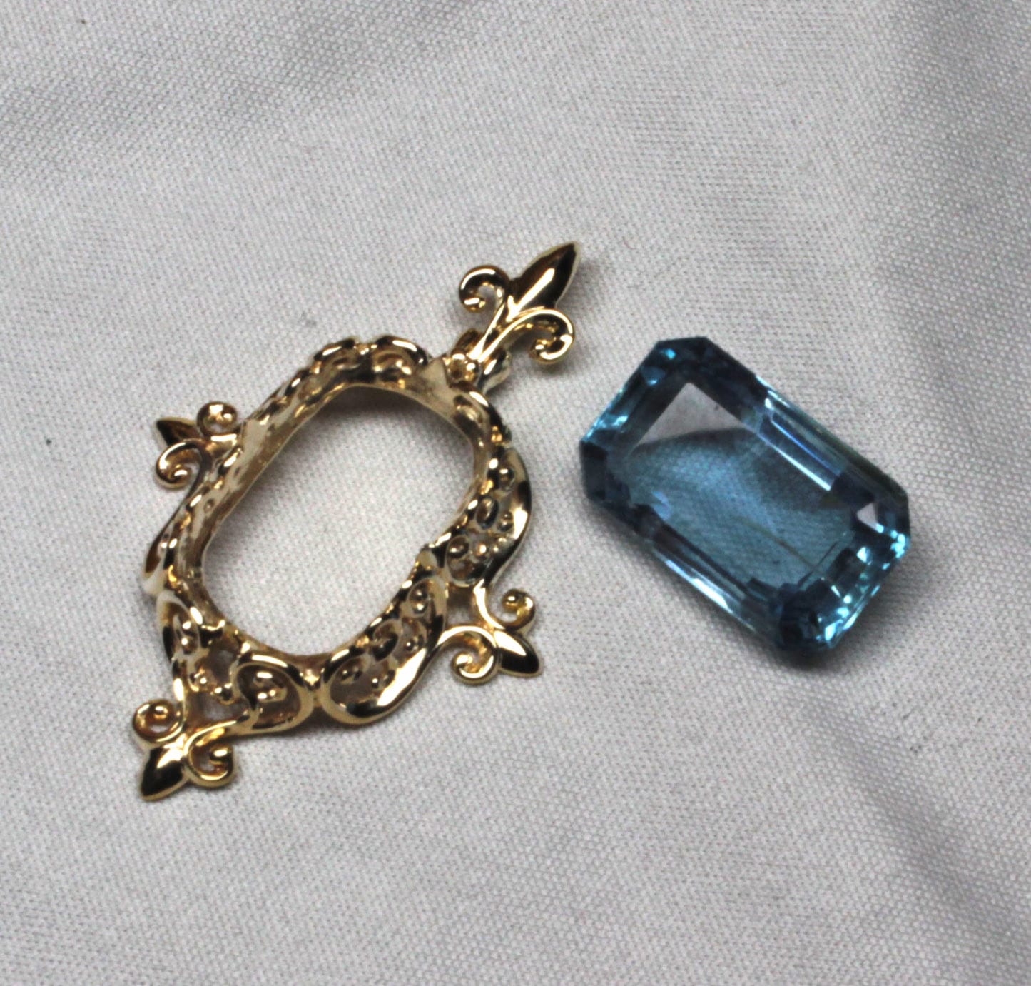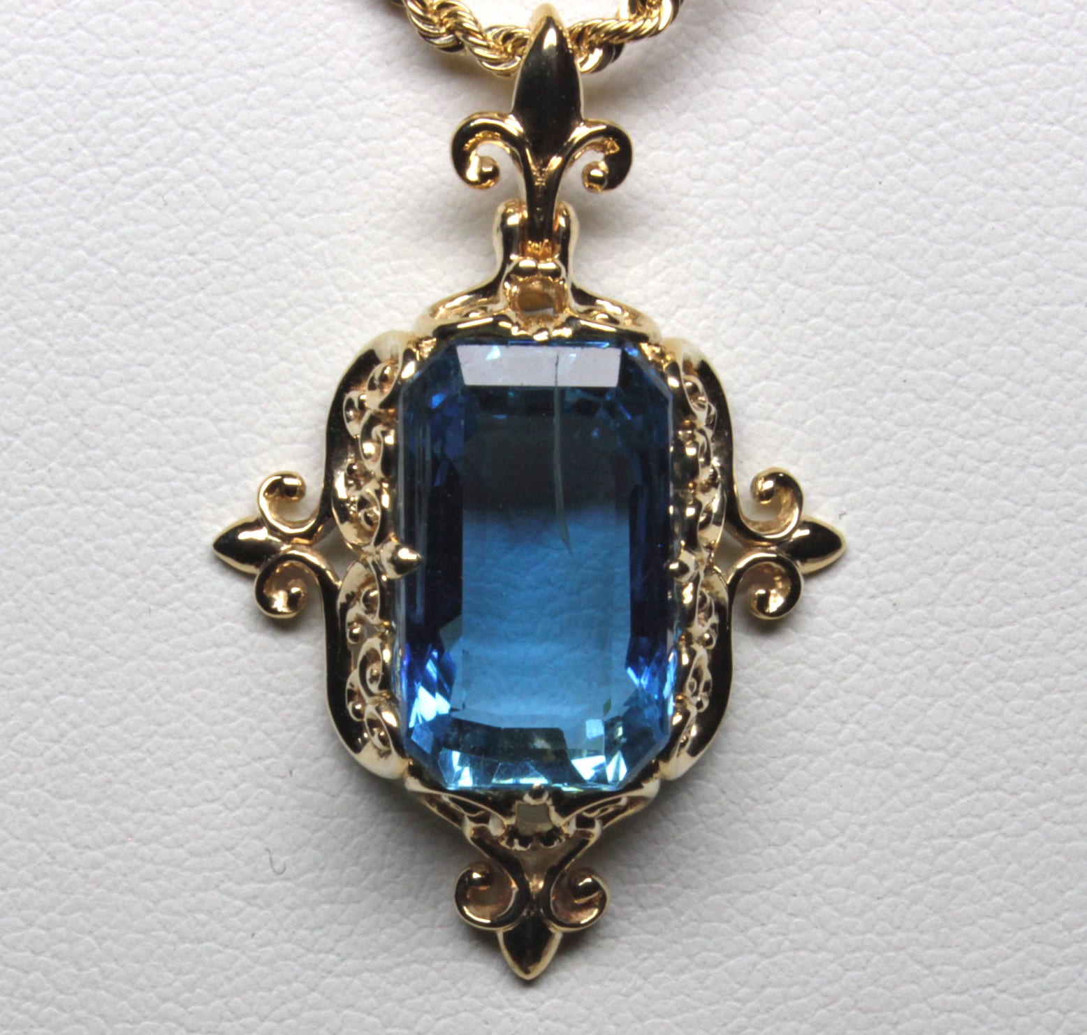 The setting was first carved in wax and then cast in 18K yellow gold to perfectly fit the 11.95ct, 16.5mm X 11mm Santa Maria aquamarine. George designed the setting so that the stone can be seen through openings in its sides as well as from its front. It is designed so that the stone rests close to the tops of the curls of gold that make it up, four tall prongs to secure it. The result is that you get to see the stone in all of its beauty. A chain is not included but you may order one in just about any link style and length. The chains that we carry are top quality Italian chains. The setting was finished by hand. The natural 11.95 ct aquamarine has about the best color you will ever see. Stones of this quality are very rare. You may order This setting for any any type of stone that is close to the aquamarine in shape and size. An amethyst or Garnet, for example would look great in it and would cost much less. It is available in 14, 18, 22K and in rose, white and yellow gold. We have a page that explains more about custom orders. It also has a selection of some of our favorite custom pieces: https://postgatejewelers.com/special-order-jewelry/ This pendant will be sent out within a week. Custom orders will ship in three weeks to a couple of months depending on our schedule. We have a wide selection of our work on FaceBook. Some pieces are shown in various stages of completion. When we do a special piece for a customer we often send them image of waxes. This makes it easier for them to understand what we are doing. It also allows us to work together and insure the creation of something special: https://www.facebook.com/Postgate-Fine-Jewelers-111540785537658/photos/?view_public_for=111540785537658&ref=page_internal Aquamarine Victorian pendant, Details: