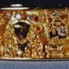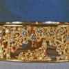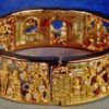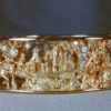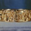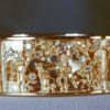 Beauty and the beast bracelet, I've done my best to capture some of that story's magic in this bracelet. The bracelet is divided into separate scenes that begin at the bracelet's clasp showing Beauty's father cowering before the Beast with the blue rose in his hand. In the next scene Beauty and her father ride to the Beast's castle. My favorite scene is in the bracelet's center. The beast is on his knee asking Beauty to be his. She shyly turns away in rejection. The scene takes place in the castle, and there is a table set with a pitcher and two goblets on it in the scene. The scenes continue on to the Beast's transformation into Prince Charming at their conclusion.