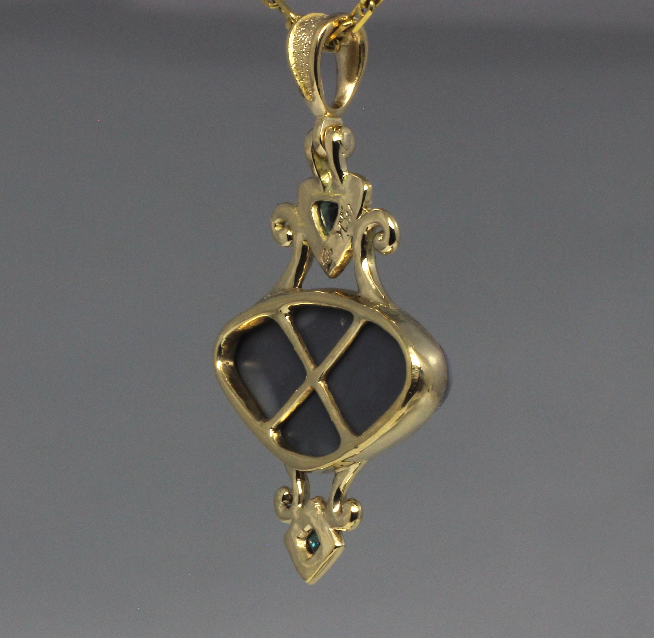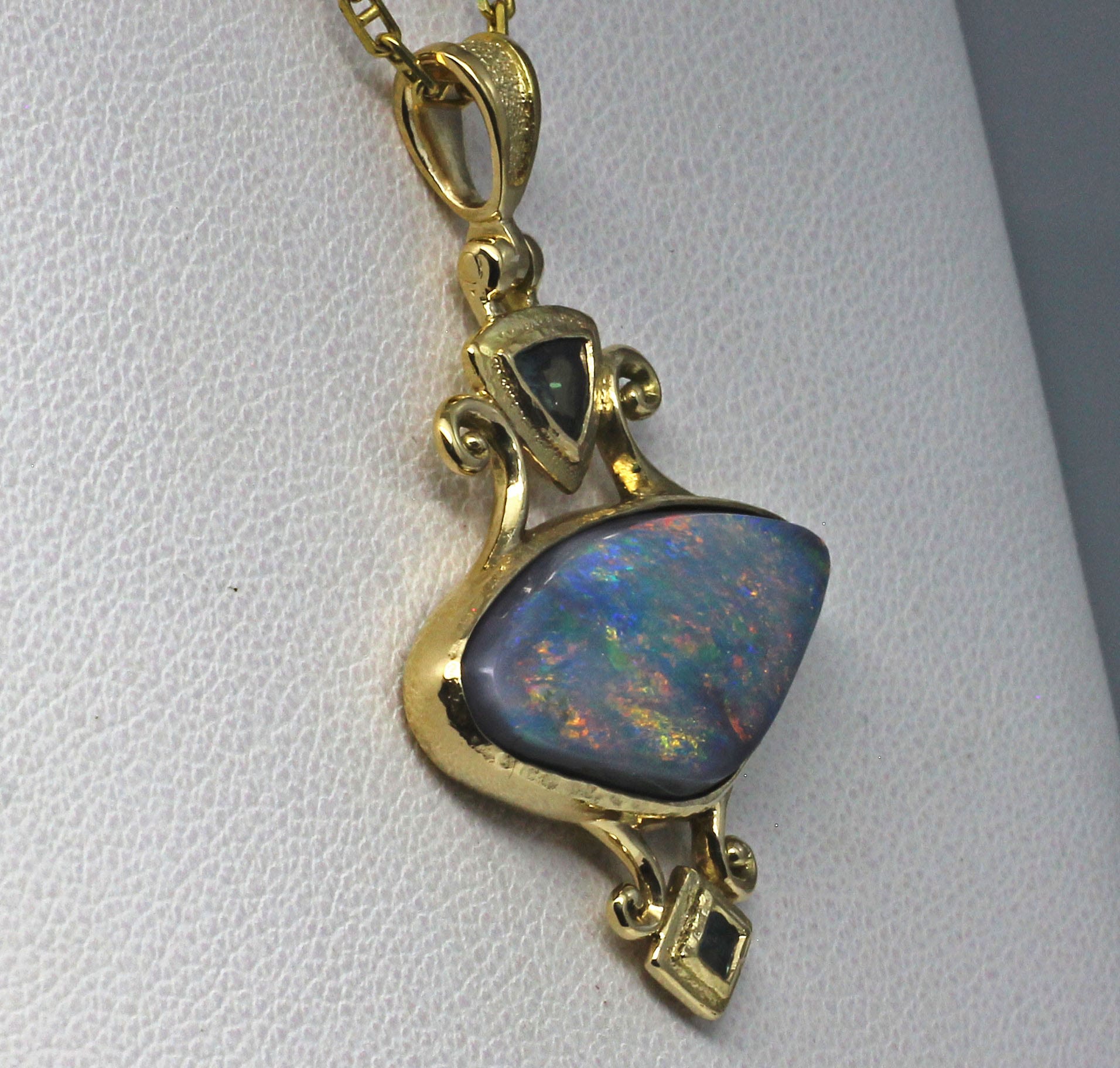 Black opal and Russian alexandrite pendant, Hand carved in wax, cast, and finished in 18k gold by hand. It features a large, solid, Australian black opal from Lightning Ridge Australia. A natural trillion cut alexandrite from Russia is set above the opal. A small square alexandrite, probably from Brazil, is set below it. The pendant was inspired by the Arts and Crafts movement of the early 1900's. If you would like to see an image of the pendant in wax as it would have been shown to a customer if it was a custom order, before it's stones were removed for casting please see https://postgatejewelers.com/alexandrite-and-black-opal-pendant-in-wax/