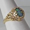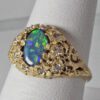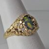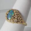 The opal measures approximately 8.5 X 5.2 mm, and is oval in shape, the stone weighs 0.75 ct. The diamonds in the centers of the nine flowers around the opal are very high quality. Each diamond measures approximately 1.5 mm and is VS G-H in clarity and color. Leaves, vines and even flower petals serve as the prongs that secure the opal within its bouquet of beautiful flowers. This ring was first hand carved in wax, and then cast in 18k gold. Some of the flower petals rise slightly higher that the opal which gives the stone good protection If you would like to see this ring as it looked in the wax please click on this link. https://postgatejewelers.com/black-opal-flower-ring-in-wax/ When I make a custom piece this is how I show my customers how their treasure is developing. It also give them a chance to give me feedback which helps me make sure that they will love their newly created treasure. A black opal flower ring that I made many years ago left me feeling that I might not find another stone that I liked as much. Finally I found the stone that has given me a chance to make a new black opal flower ring, and one that I like as much I started making floral theme jewelry about 1970 and I still get a lot of pleasure out of these designs. Even though I have made many of them I am always captivated by the challenge of trying to bring the beauty I find in nature to pieces of fine jewelry. We have a wide selection of our work on FaceBook. Some pieces are shown in various stages of completion. When we do a special piece for a customer we often send them image of waxes. This makes it easier for them to understand what we are doing. It also allows us to work together and insure the creation of something special: https://www.facebook.com/Postgate-Fine-Jewelers-111540785537658/photos/?view_public_for=111540785537658 Details: