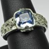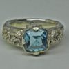 Blue Topaz Dragon Ring, Norse dragons are carved on either side of the blue topaz centerstone. The Blue Topaz Dragon Ring was inspired by both Viking and Celtic art. Gripping beast designs were favorites of the ancient Celts as well as the Vikings. They appear in works of art from the designs carved into Viking long ships to ancient Celtic manuscripts like the “Book of Kells.” Suzan hand carved this ring and then cast and finished it all by hand. The ring is made of sterling silver. It is set with a beautiful 8mm square faceted blue topaz. A fierce dragon guards the stone on either side.