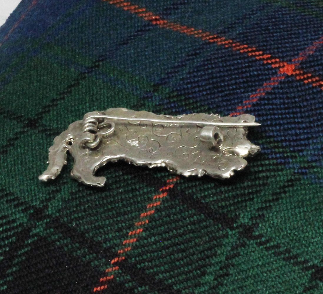 Suzan hand carved the border collie brooch in wax before casting it in sterling silver. The brooch is approximately 1 3/4″ X 7/8″ in size and completely hand carved. The brooch has a very light patina. If you have a dog that you would like to wear, just get in touch with us and we will make it for you. Here is a link to some other pieces that you might like: https://postgatejewelers.com/product-category/flowers-vines-and-animal-jewelry/