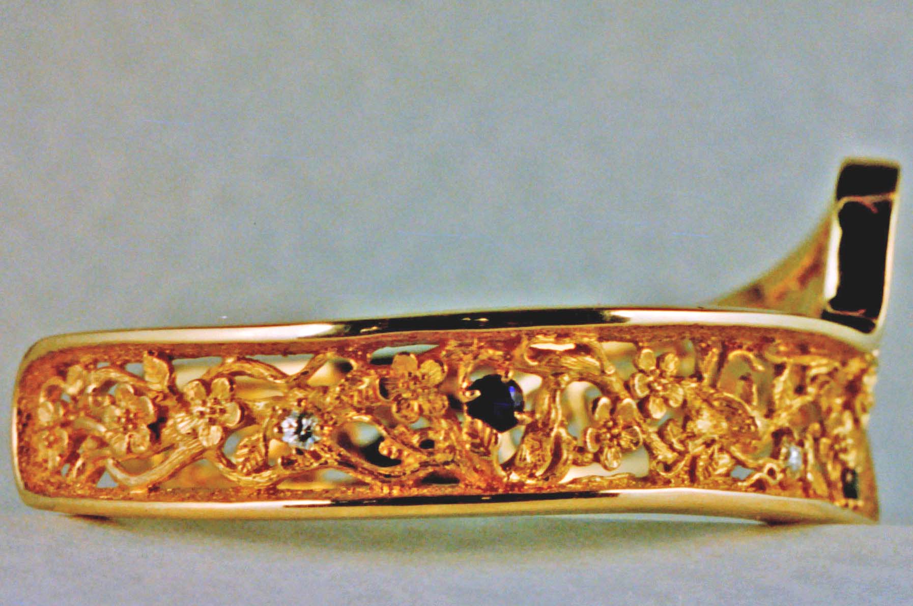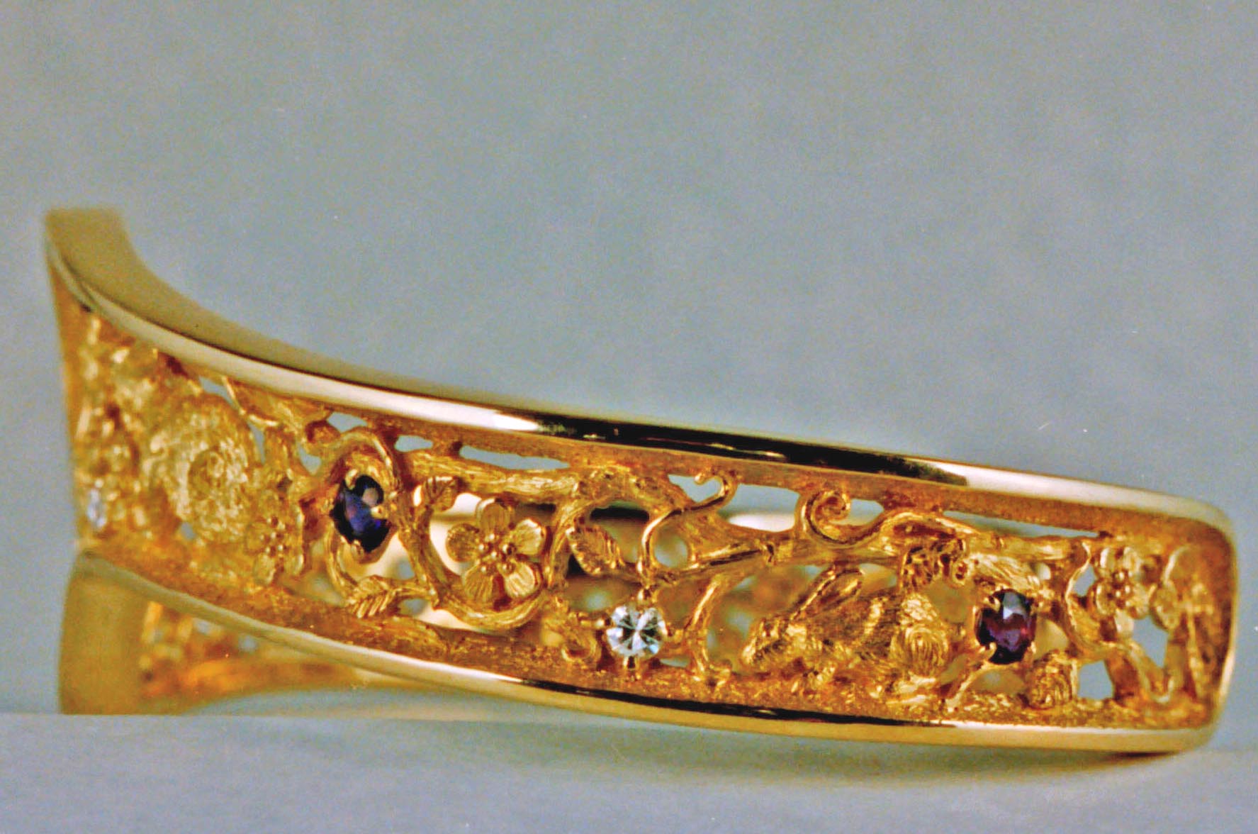 Bunny bracelet in 18K: This is one that I've made a few times and each one has been different. The bracelets shown are set with different stones and are also two different versions of the bracelet. The borders of the bracelet are fairly deep and thick to insure that it will hold up to constant wear. One is a simple cuff style bracelet, and one is hinged with a special clasp. The clasp is one of my own design, it is both secure and easy to work, even with long nails or poor eyesight. This is one of my favorite bracelets, one that I've given Suzan along with the dancing bunnies pendant.