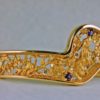 Bunny bracelet in 18K: This is one that I've made a few times and each one has been different. The bracelets shown are set with different stones and are also two different versions of the bracelet. The borders of the bracelet are fairly deep and thick to insure that it will hold up to constant wear. One is a simple cuff style bracelet, and one is hinged with a special clasp. The clasp is one of my own design, it is both secure and easy to work, even with long nails or poor eyesight. This is one of my favorite bracelets, one that I've given Suzan along with the dancing bunnies pendant.
