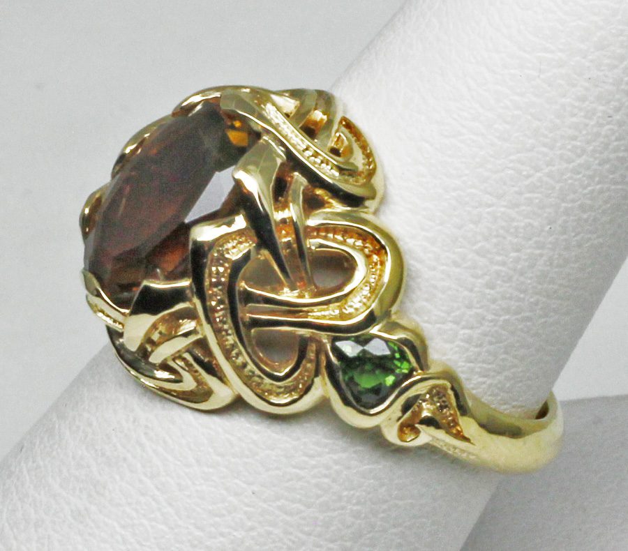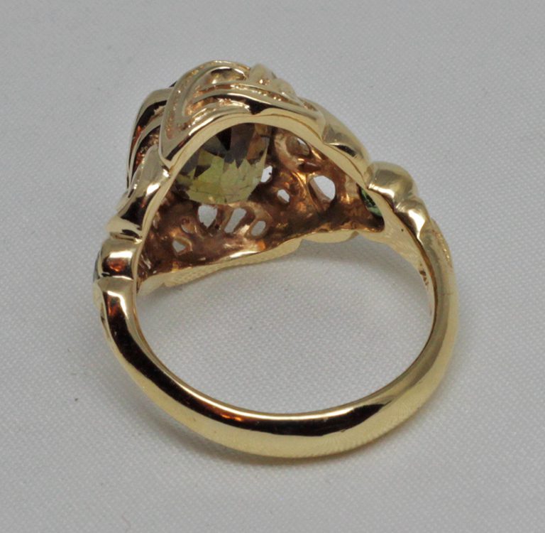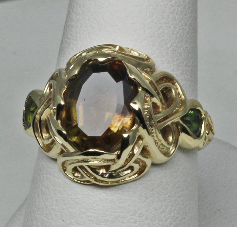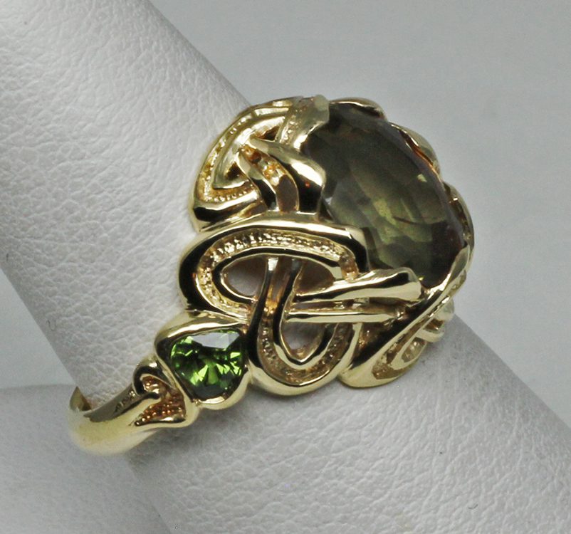 The ring is a Celtic ring of open knots that cradle an approximately 11 X 18.4 X 5.8mm deep cushion shaped andalusite. The stone is naturally iridescent with a medium dark green or amber colored stone. It nicely displays different colors as it is moved. A pear shaped 3.5 X 3.5mm, green tourmaline is set on either side of the andalusite. Like many gemstones the andalusite is included. Inclusions account for some of my favorite gems. There would be no rutilated quartz or star sapphires without them. Then there are stones that are so rare and valuable that we don’t mind a few flaws. Emeralds are so rarely without flaws that the flaws sometimes help sell a stone. Flaws in emeralds are sometimes referred to as veils and gardens. This stone falls into that category. A stone lover will have no problem loving this one, A person who wants a perfect gem won’t like it.
