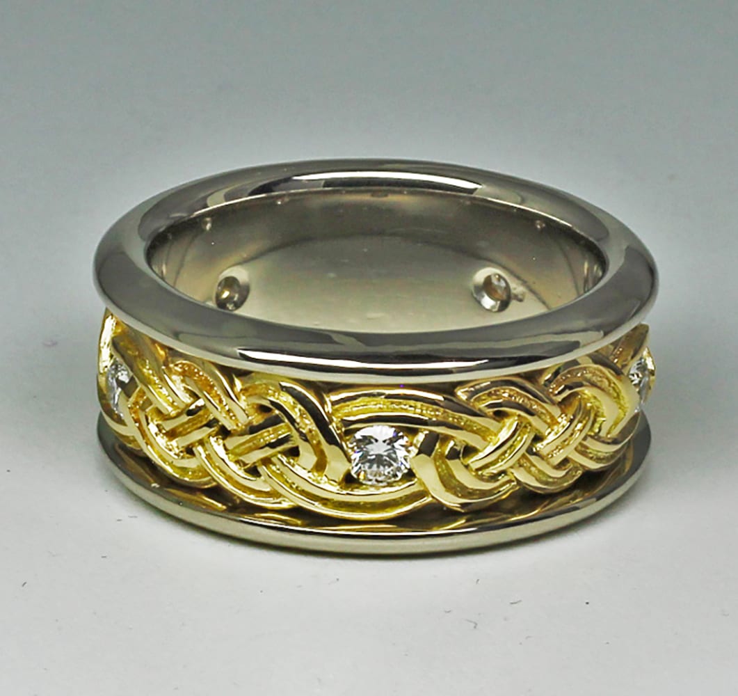 Celtic Diamond Knot Band, This band was hand carved in wax and hand finished in 18K yellow gold by George. He has taken one of the most loved Celtic designs and turned it into a masterpiece. It is more unique, dimensional, and vital, than those produced by other means. The band is powerful, beautiful, and Heavy enough to last for generations. I prefer as wide a band as is comfortable to wear. A larger band allows one to better see its details and the reflections of light and colors, dancing upon its polished surfaces. If you love Celtic jewelry please check out ours: https://postgatejewelers.com/product-category/celtic-jewelry/ Here is a version the band with no stones: https://www.postgatejewelers.com/product/celtic-two-tone-knot-band/