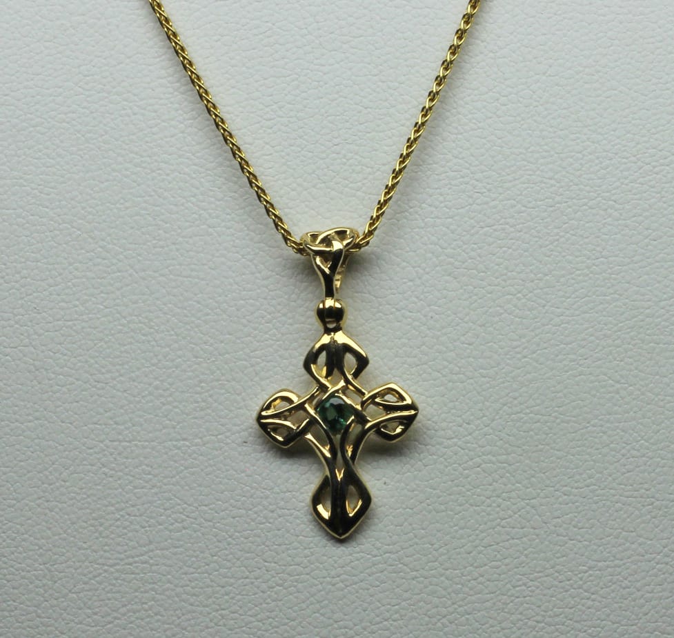 Celtic emerald cross, Shown here is the smallest cross that George now makes The cross is hand carved in 14K yellow gold. It has a very fine natural faceted 3mm emerald set into its knot-work. We have also made a Celtic Welsh version of the cross in case you have welsh heritage that you would like to celebrate, Click this link to see: https://postgatejewelers.com/product/welsh-love-spoon-celtic-cross/