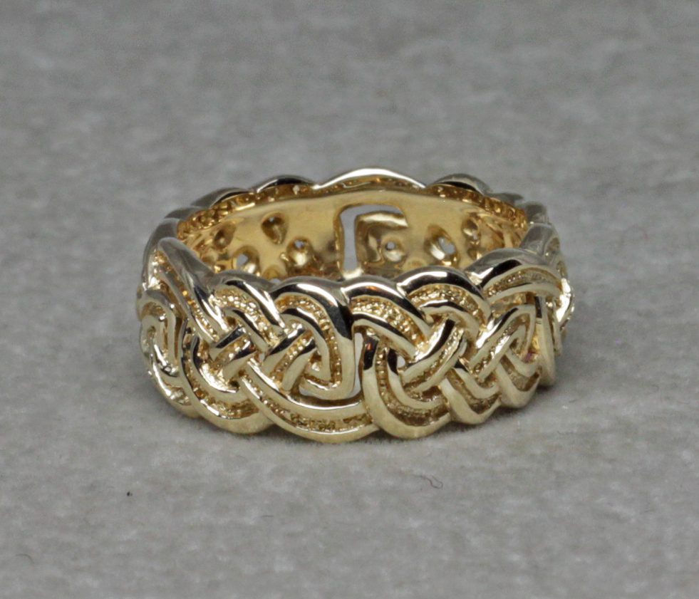Celtic eternity knot band, our version of one of the most loved traditional Celtic knot designs. Yes it is my favorite, I chose it for my own wedding band. This knot can be found in both modern and ancient Celtic and Viking art. It is beautifully carved in a very pleasing, Celtic knot-work pattern. This knot design is one of the most loved Celtic knot bands. I’ve done my best to insure that this one will be the nicest example that you will ever see. This band was carved by hand. It is much more dimensional than rings produced by most other means. The rounded knots and their slight differences create a flow and rhythm to the design that plays like music. Reflections of light and colors, dance upon the surfaces of the knots beautifully.
