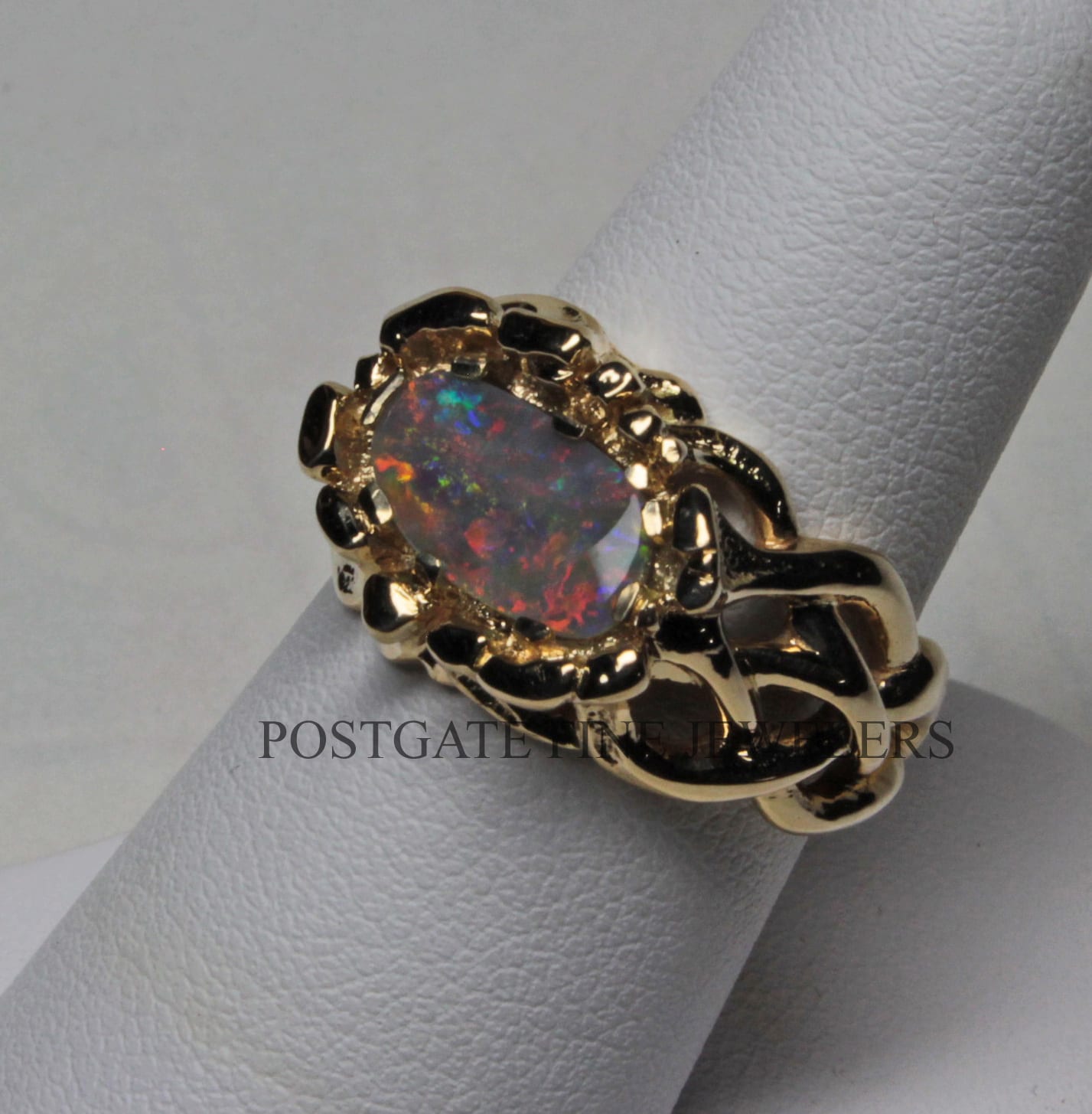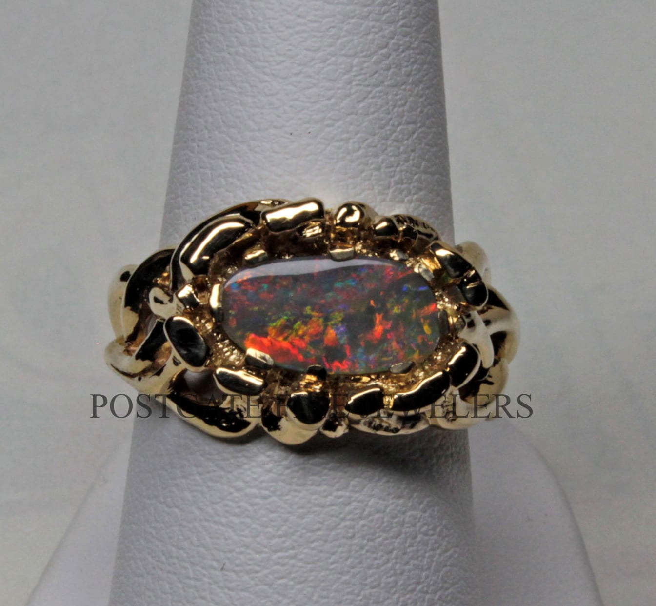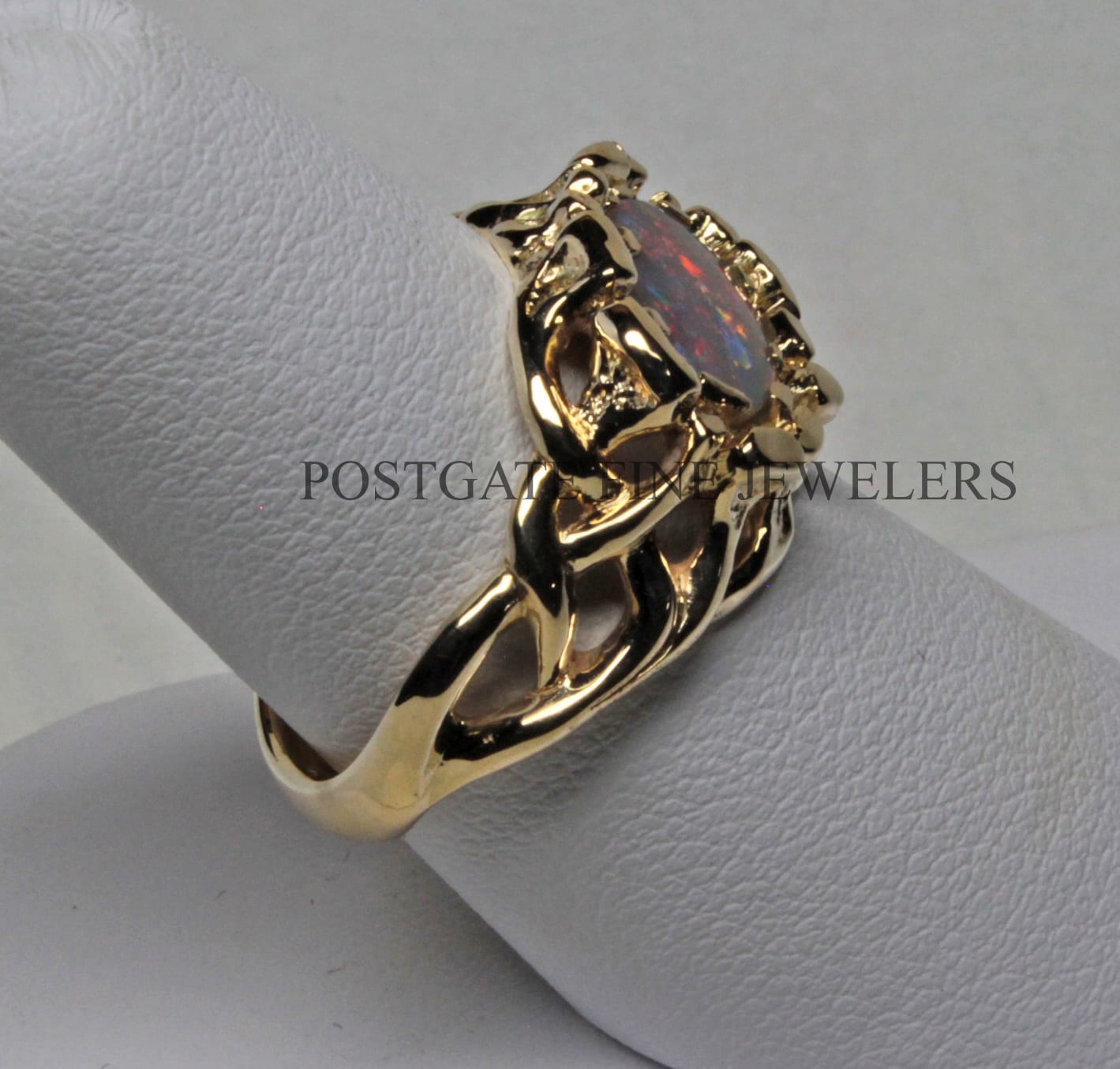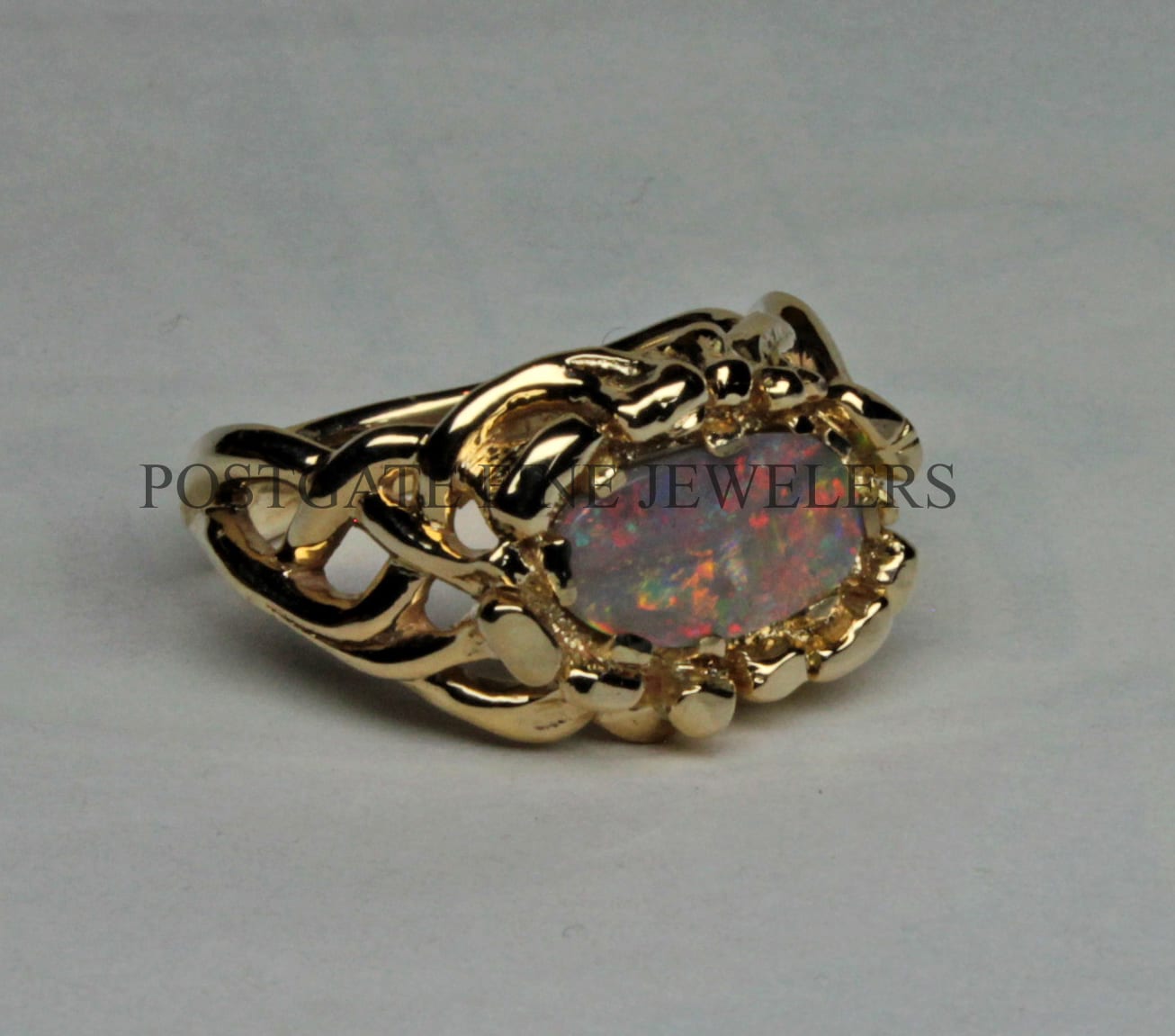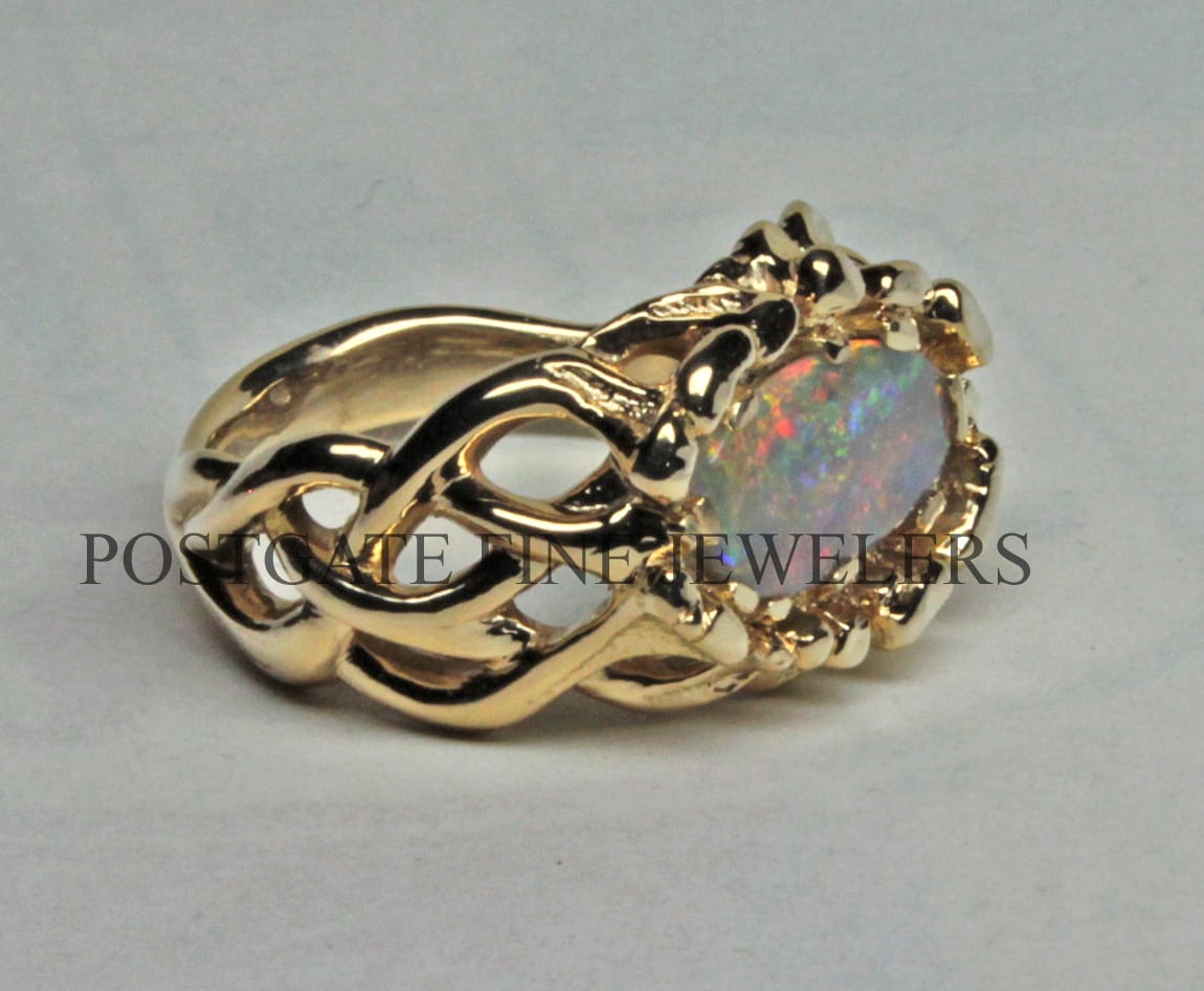 The opal is a solid black opal from the New South Wales region of Australia which is one of two regions where fine black opals are found. This is a Lightning Ridge stone. The opal is an exceptional stone displaying a patchwork of colors primarily made up of reds, blues, oranges, and greens. Colorful and constantly changing, the stone makes me think of viewing an exotic forest from a window. The colors of a black opal are stronger than other types. One of the things I love most about these stones is that they show their colors very strongly in diminished light, when other stones just fade. This stone weighs 1.2 cts. 14 k gold, Natural black solid Australian opal. You may order the Celtic Fire opal ring in almost any size. We have great sources for opals and usually have beautiful stones that will work in this setting perfectly. As a custom order you can have one made in 14, 18, 22 K and in rose, white and yellow gold. We have a page that explains more about custom orders. It also has a selection of some of our favorite custom pieces: https://postgatejewelers.com/special-order-jewelry/ Custom orders of the ring will ship in three weeks to a couple of months depending on our schedule. We have a wide selection of our work on FaceBook. Some pieces are shown in various stages of completion. When we do a special piece for a customer we often send them image of waxes. This makes it easier for them to understand what we are doing. It also allows us to work together and insure the creation of something special: https://www.facebook.com/Postgate-Fine-Jewelers-111540785537658/photos/?view_public_for=111540785537658&ref=page_internalCeltic Fire Black opal ring, Details: