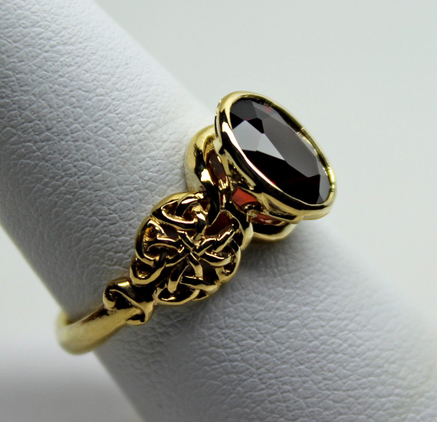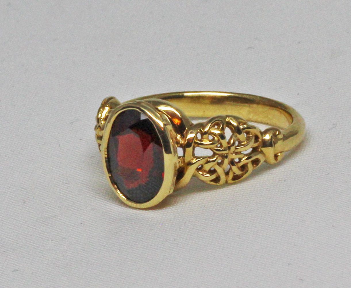 The garnet is set in a bezel setting. this is the most secure type of setting since the stone is set into a rim of gold that covers its entire girdle. The advantage of a bezel setting is that even if it does wear through after many years, the stone will not be lost. This is also a very smooth setting that will not catch on clothing. A bezel setting doesn’t cover more of a stone than a pronged setting, since prongs have to come farther onto the stone to do their job. Check out more of our Celtic Designs here: https://postgatejewelers.com/product-category/celtic-jewelry/