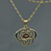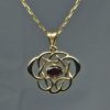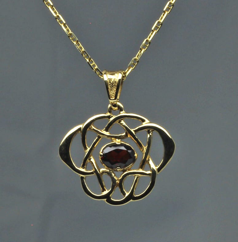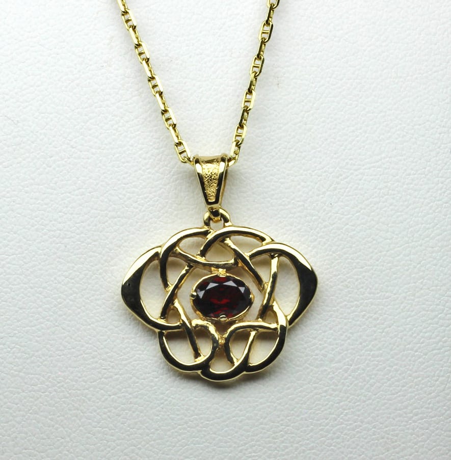 Celtic garnet pendant was designed and made by Suzan. The design is an open knot-work of 14K gold. The pendant is set with a very nice medium dark faceted garnet. Suzan can make this setting for just about any stone that you would like, faceted or cabochon as a custom order. Garnet is the birthstone for January. It is thought to help with blood issues and to improve physical love and relationships. We have several Celtic pieces that you might enjoy, click here to view: https://postgatejewelers.com/product-category/celtic-jewelry/