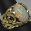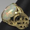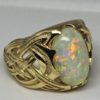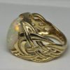 Celtic opal thistle ring, Its design was the inspired by Scottish thistles. Celtic knot work in 14K gold transitions into an abstract thistle which becomes the setting for the opal. Normally we would set such a large opal into a pendant to help protect it from damage. That would mean the wearer would only occasionally get to enjoy the beauty of this incredibly beautiful stone. A ring on the other hand, will allow its wearer to constantly enjoy the dancing, flowing, and flashing colors in the stone. We have seen many people who have worn opals in exposed ring settings for many years without incident. If you are one of these careful persons, here is a wonderful ring for you.
