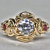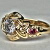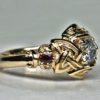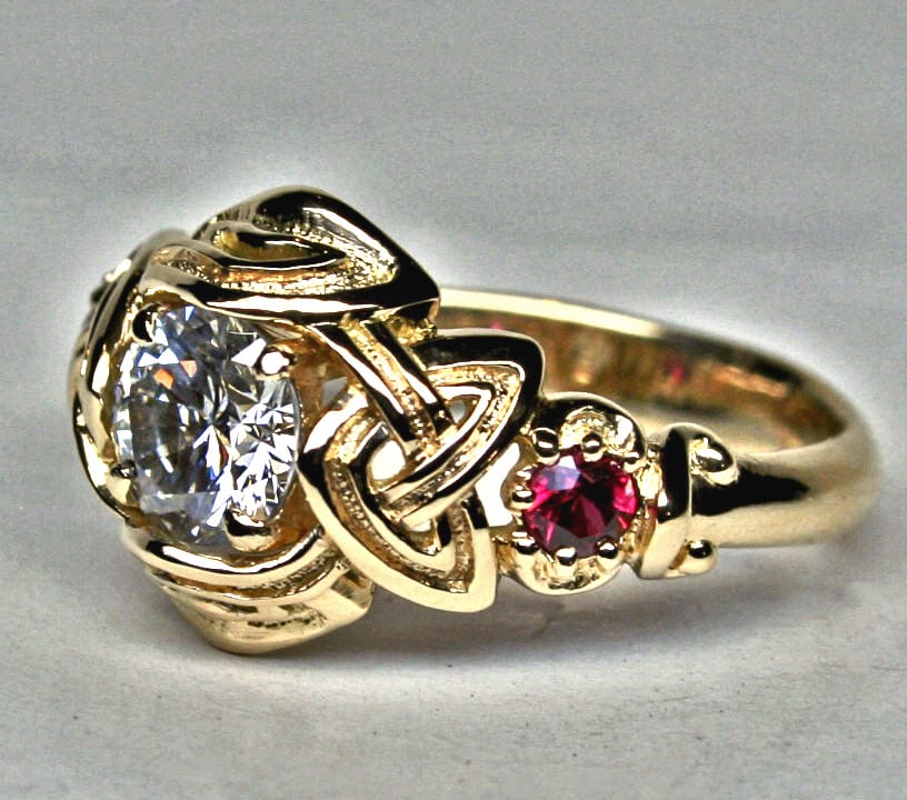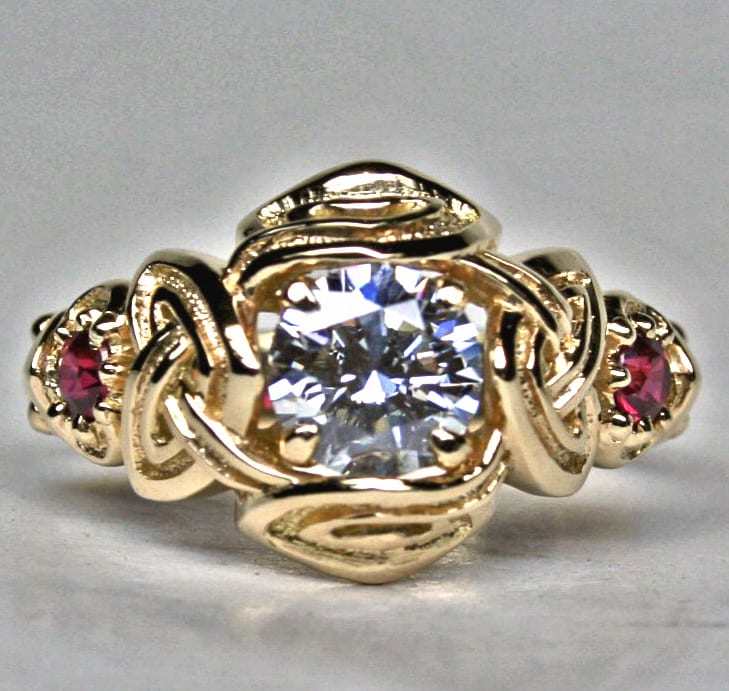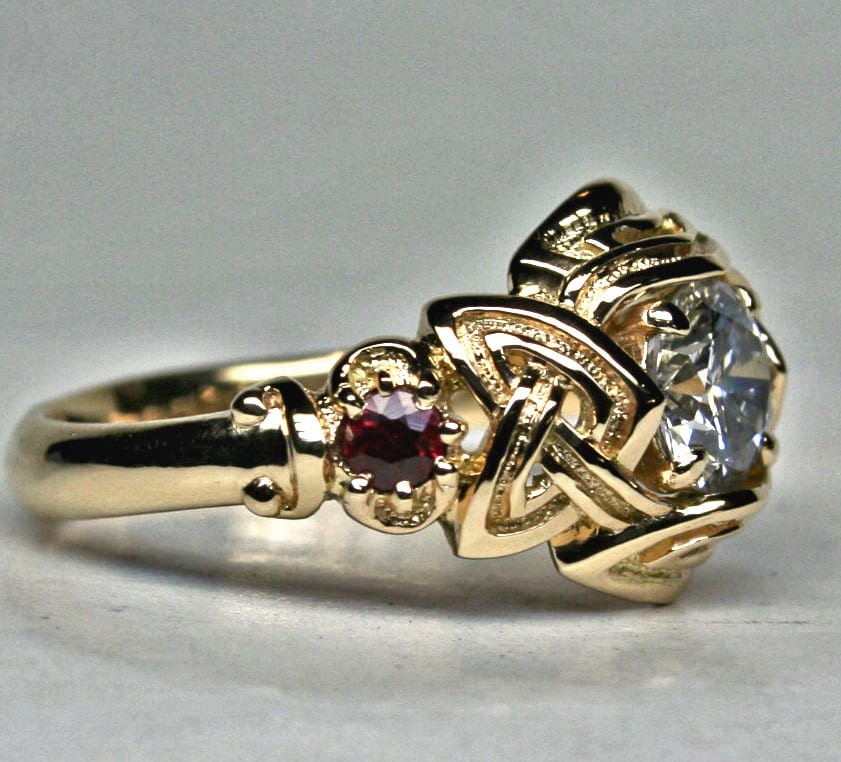Celtic three stone engagement ring with rubies and 1 ct. diamond, in 18K by George Postgate