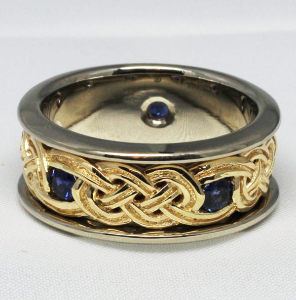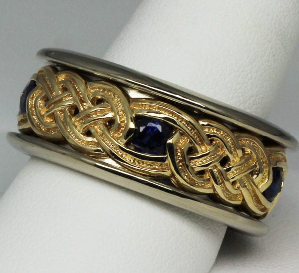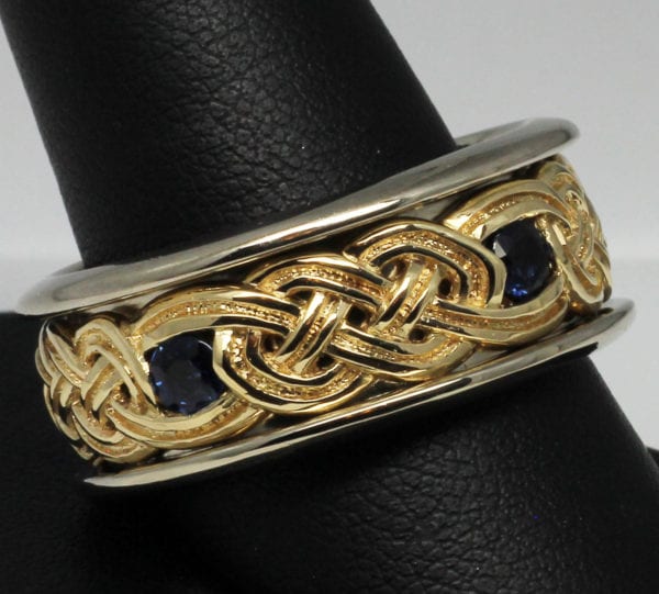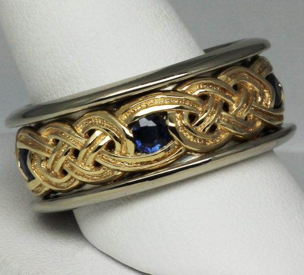 Celtic Two Tone Knot Band with sapphires 18k Yellow, and 14D Gold, Size 12 1/2 by George, https://postgatejewelers.com