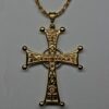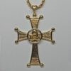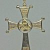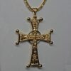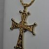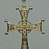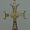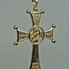 The cross is about 2 1/4" X 1 1/2" in size. The front of the cross has a white 14KPD gold circle in its center encircling a Celtic trinity knot in 22K gold.