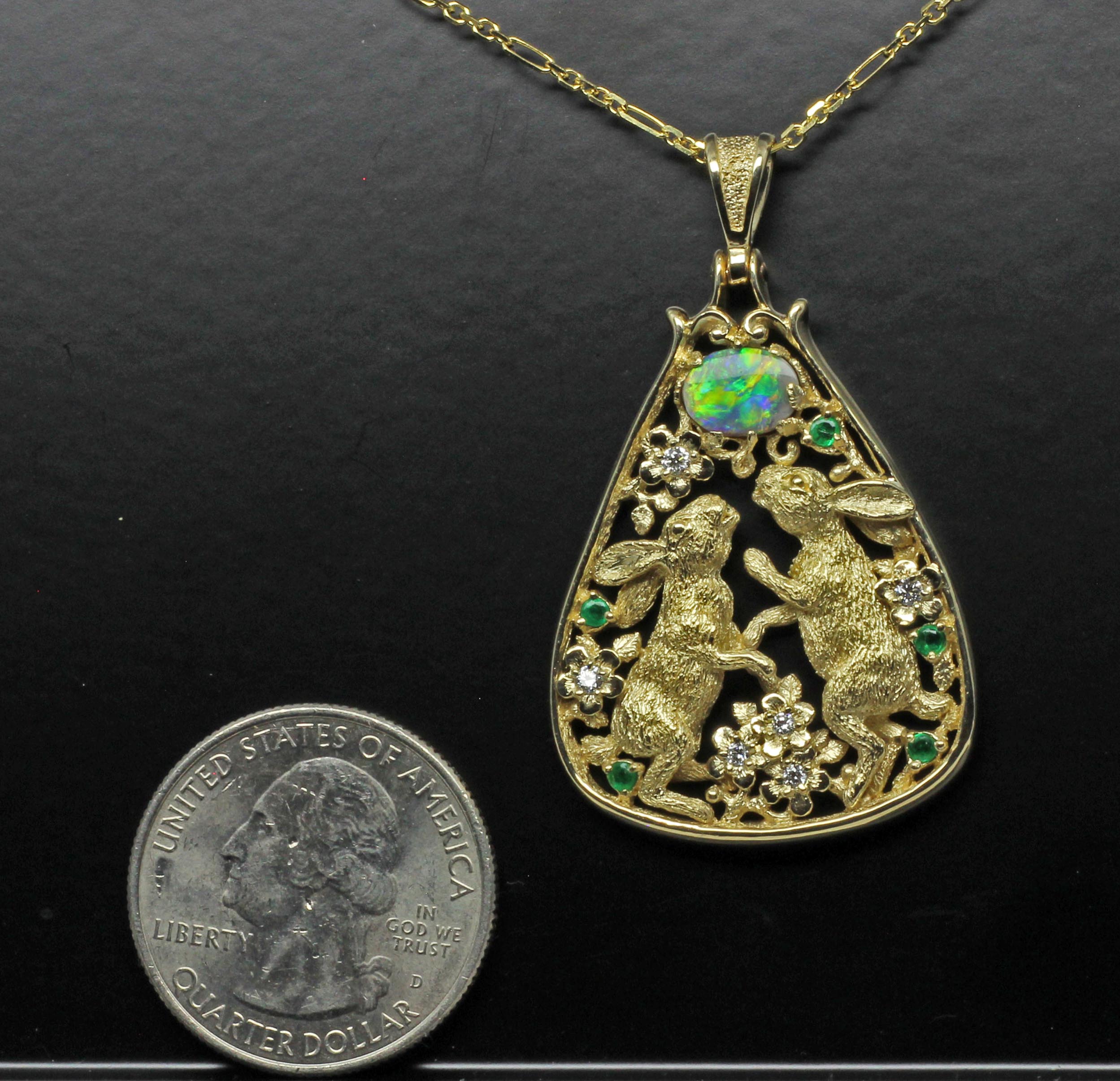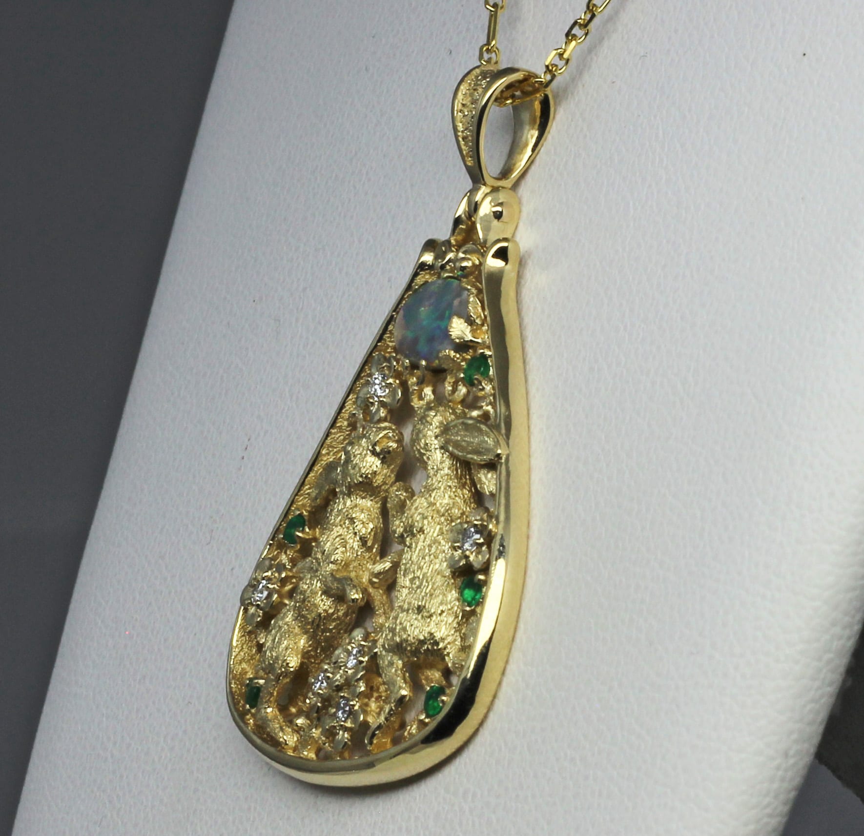Dancing Bunnies opal pendant in 14 K with emeralds and diamonds by George
