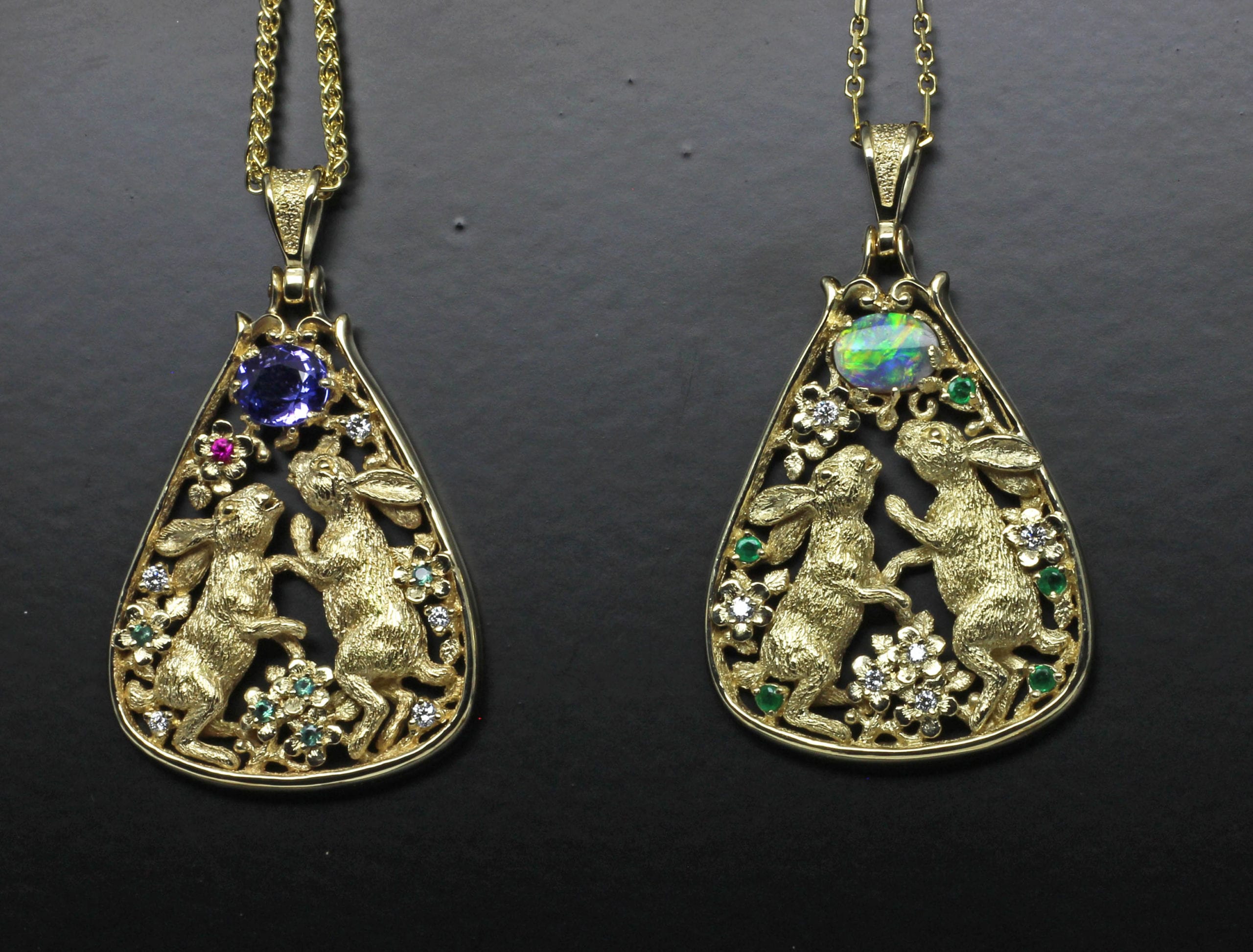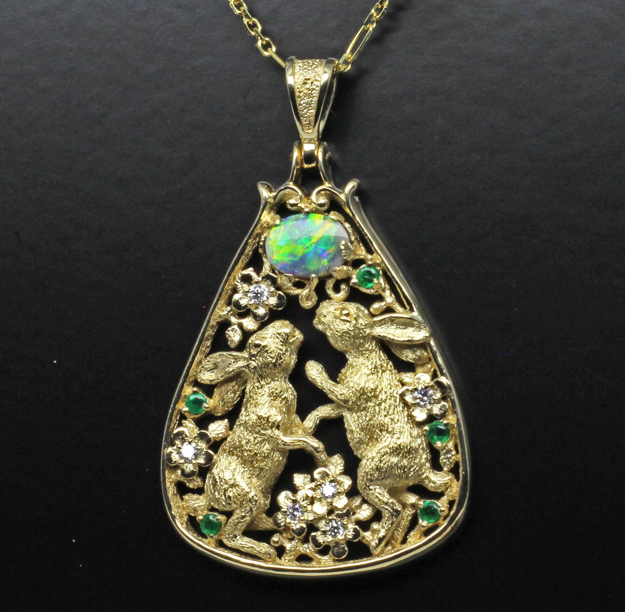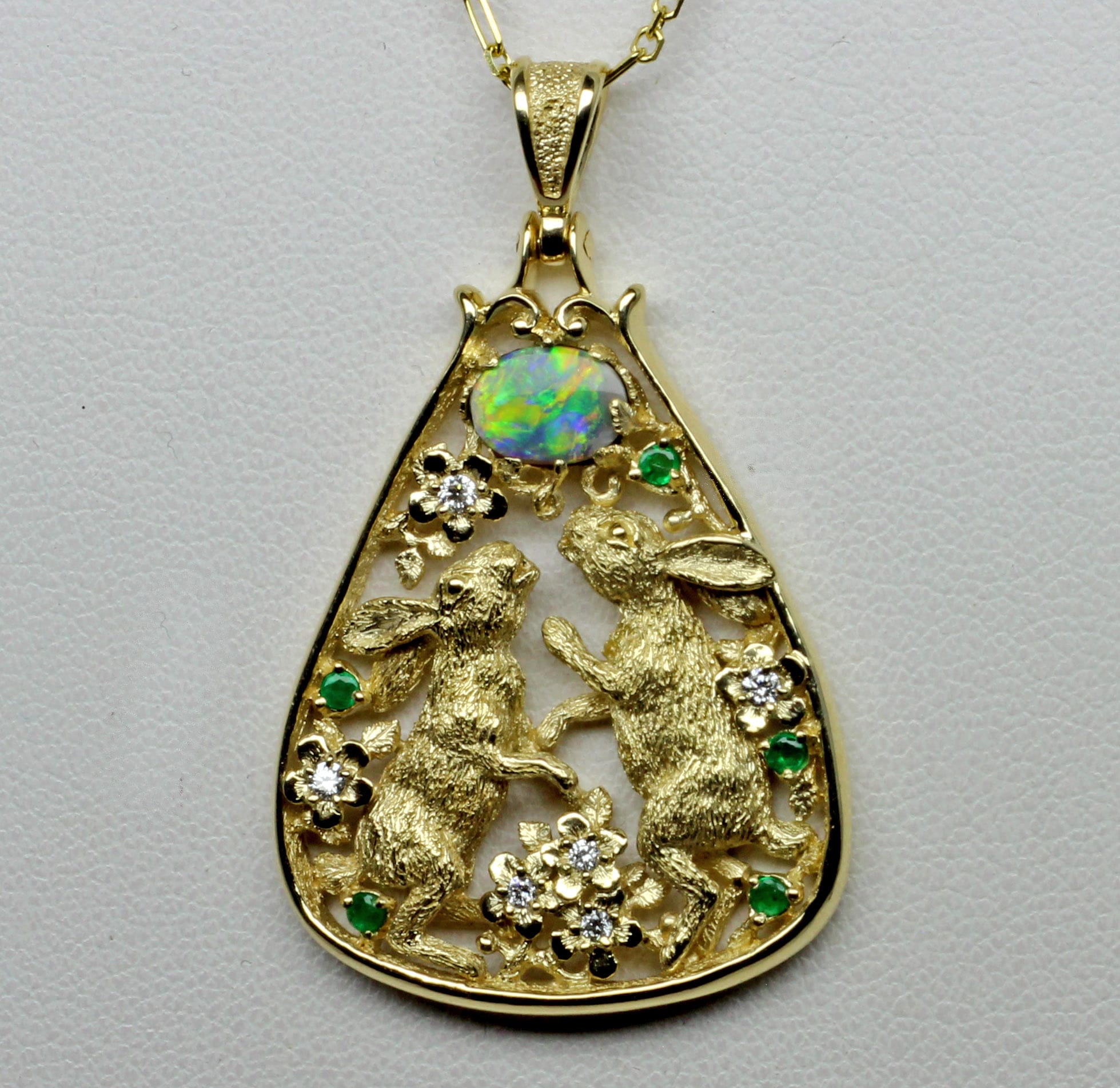 The pendant is a hand carved creation of George’s made in 14 K gold. It is shown with an included 1.4 mm figaro link 18″ chain. The pendant is approximately 1 and 3/4″ X 1 and 1/4″ including its bale in size. The opal is a natural Australian opal from Lightning ridge. The stone is so bright that it seems to have its own light source. The five diamonds in the flowers are natural stones averaging G to H in color and VS2 in clarity. The emeralds have great color and as most emeralds, a few flaws. The small stones are about 1.5 to 1.8 mm in size. The dancing bunnies opal pendant is shown on a 1.4 mm figaro link chain that is included in its price. The figaro chain costs $375 by its self. If you would like to exchange it for one like the 1.7 mm wheat link chain shown on the tanzanite bunny pendant https://postgatejewelers.com/dancing-bunnies-tanzanite-pendant/ just let us know and we will adjust the price. The heavier chain costs $595 and is 18” in length. You may also order the pendant by its self without a chain just let us know and we will correct the price. If you would like the pendant made with different stones or gold you can order one similar to it with your choice of stones in yellow, white or rose 14 K gold. It is also available in 18 K white or yellow gold. When we make a custom order we often send an image of the pendant still in wax so that our customer can give us feedback before we finish it. https://www.facebook.com/111540785537658/photos/a.214062988618770/2592132674145111/?type=3&theater Details: