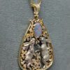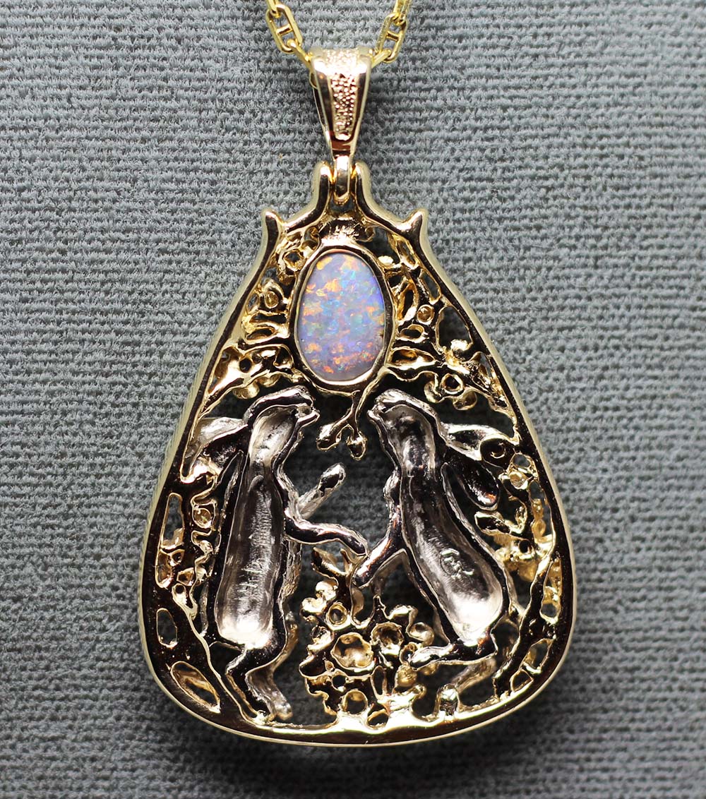 The Dancing White Rabbits Pendant with black opal is an original hand made design by George Postgate who also created it. It is made in 14K yellow gold. The rabbits are made in 14D palladium white gold. The chain is not included. If you need a chain we can provide you with a great selection of styles and lengths. Our chains are fine quality, made in Italy.