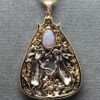 Dancing White Rabbits Pendant, Two magical white rabbits are dancing under a beautiful black opal. The stone rests in the caress of vines, leaves and flowers. Small diamonds are set among the flowers and vines. Sapphires are set in the seven flowers that grow on the vines around the bunnies. If you enjoy this sort of jewelry, you might enjoy looking at some other pieces like this? Click this link and enjoy: https://postgatejewelers.com/product-category/flowers-vines-and-animal-jewelry/