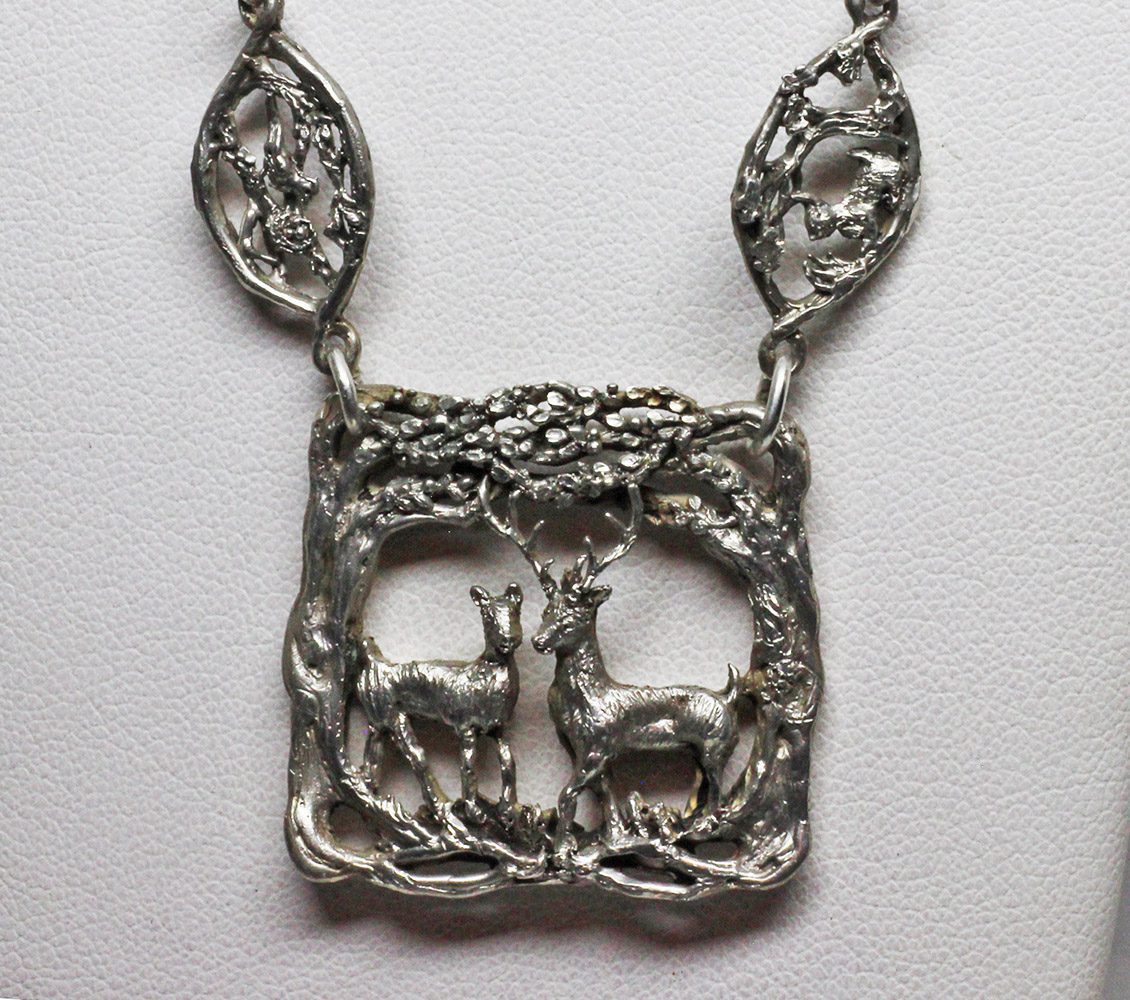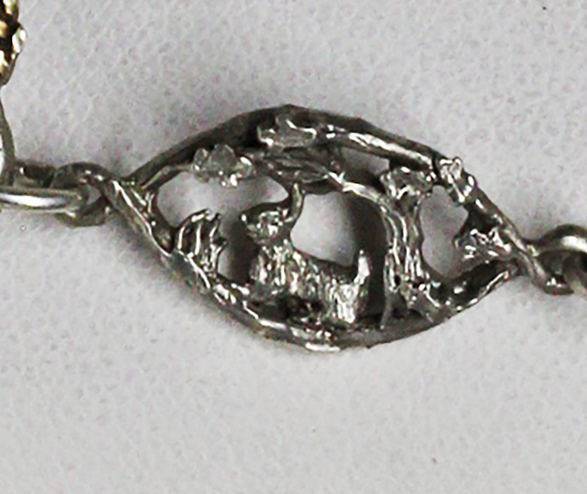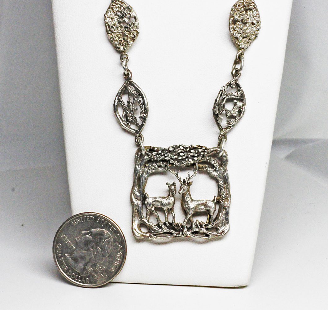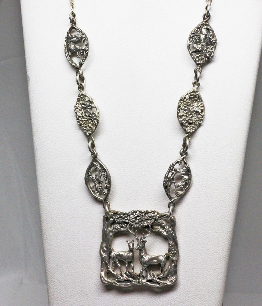 The necklace is made in sterling silver. It is features a plaque shaped pendant in a woodland scene. The pendant hangs from six oval links that each have a little forest scene within. A figaro link chain completes the necklace. The necklace is about 22" in length. It can be made adjustable by attaching the clasp to one of the larger links. You need to be careful and check for damage when you do this.