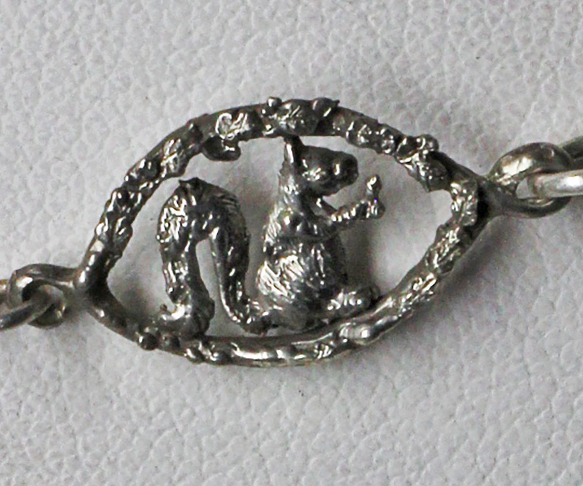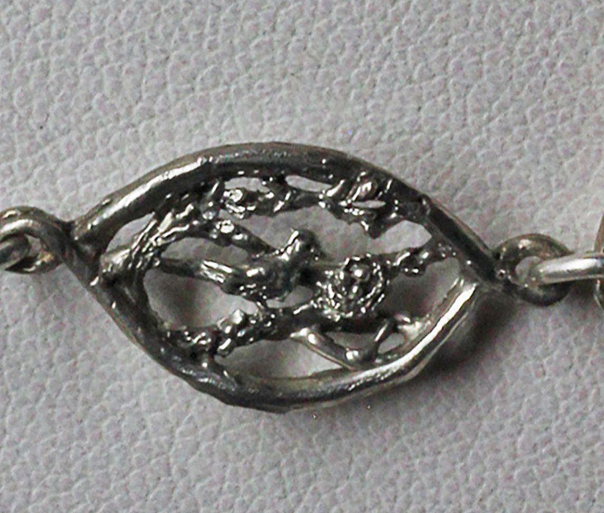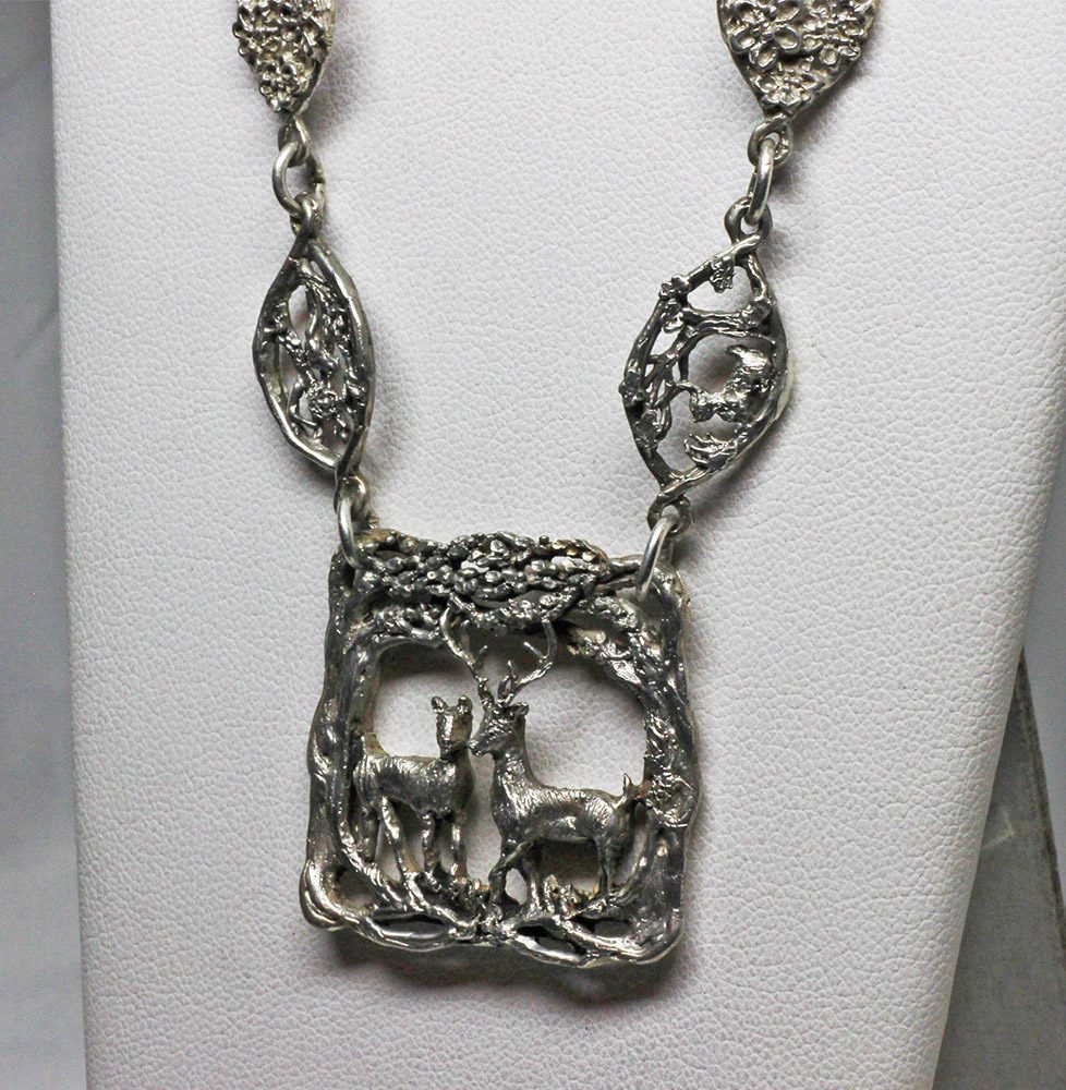 The necklace is made in sterling silver. It is features a plaque shaped pendant in a woodland scene. The pendant hangs from six oval links that each have a little forest scene within. A figaro link chain completes the necklace. The necklace is about 22" in length. It can be made adjustable by attaching the clasp to one of the larger links. You need to be careful and check for damage when you do this.