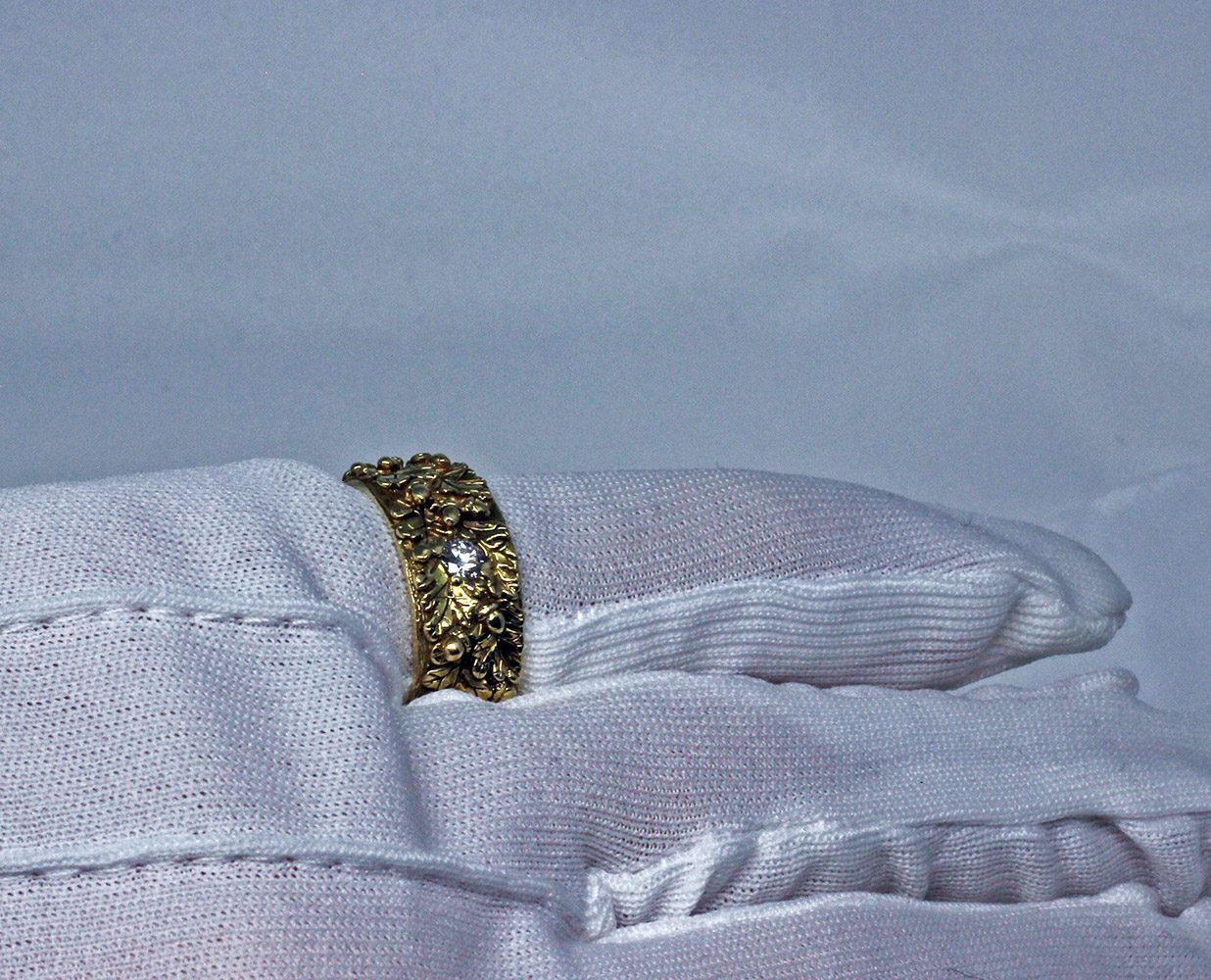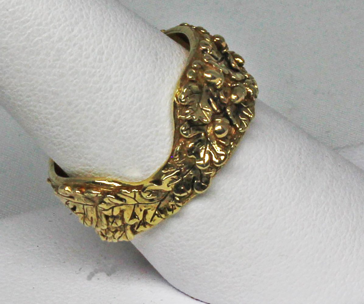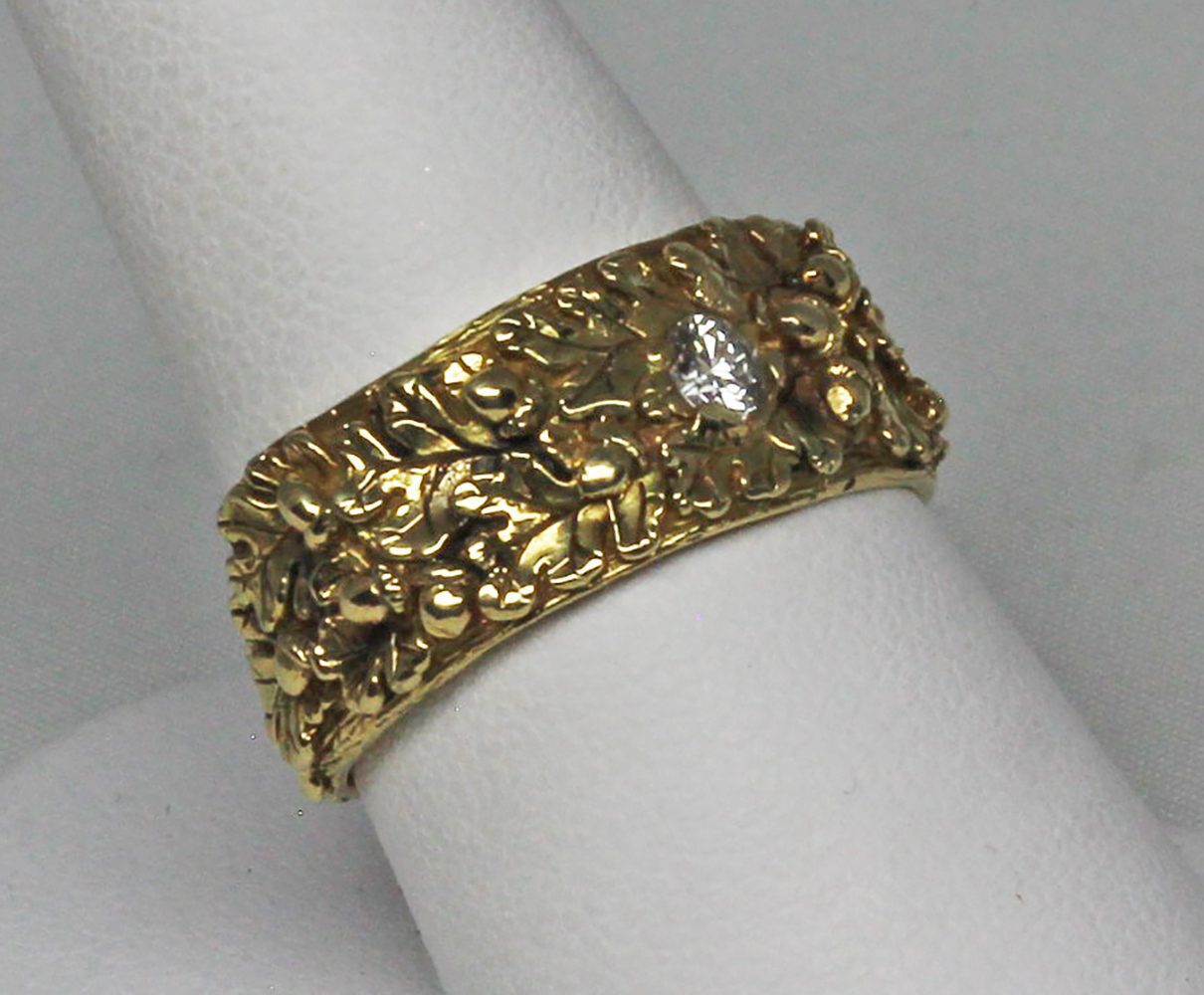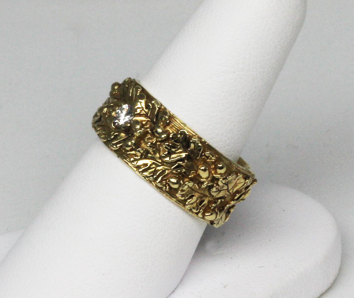 This ring is hand made, It was carved and built up in wax and then cast in 14K gold. The details, a flowing design of oak leaves and acorns are very dimensional and pleasing. A brilliant cut natural diamondVS2 G-H, 0.15cts. is set among the leaves.