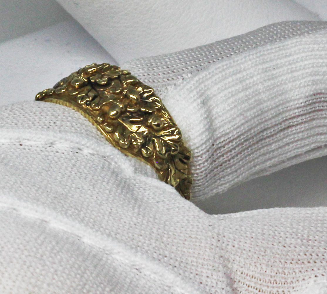Diamond oakleaf contoured band, is an original design by George Postgate who also made it by hand. The band is a special version of the acorn and oak-leaf bands he has designed and made for over 40 years. This band works great for someone who wants a wide band but doesn’t want it to make their finger seem shorter. The special contour that brings the ring back on the hand also helps keep the part of the band with the stone in place on the finger. If you love nature inspired pieces follow this link to see more: https://postgatejewelers.com/product-category/flowers-vines-and-animal-jewelry/