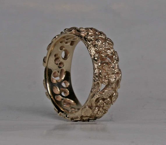 This the narrower, flower band version, it is about 1/4″ wide. Its sides are nicely rounded for comfort, and the detailing has been designed to wear well. It will continue to delight for many many years. You may order one of these bands in almost any size. It is available in 14, 18, 22K and in rose, white and yellow gold. This ring is also a great design for small stones. They work well as center for the flowers. We have a page that explains more about custom orders. It also has a selection of some of our favorite custom pieces: https://postgatejewelers.com/special-order-jewelry/