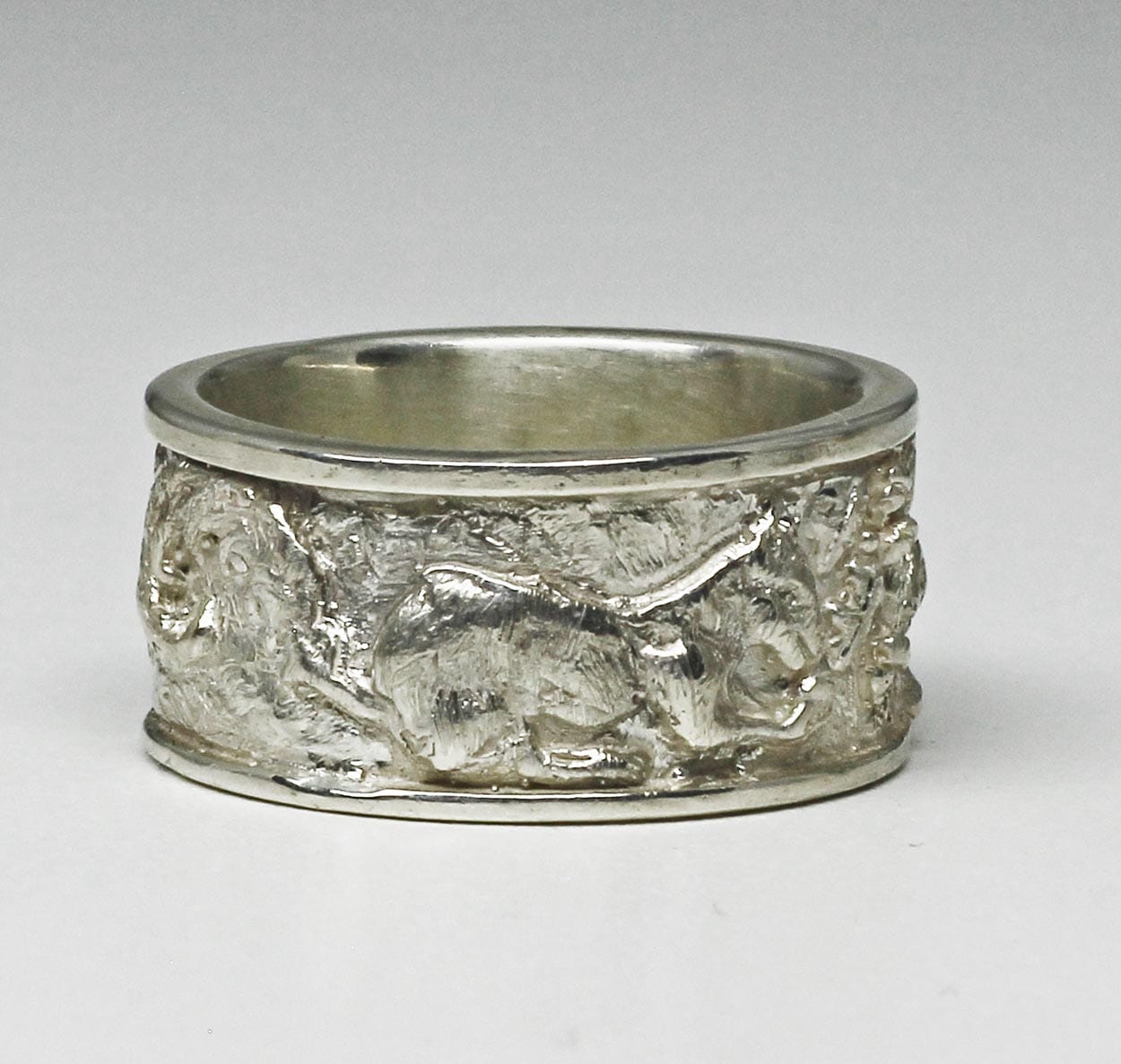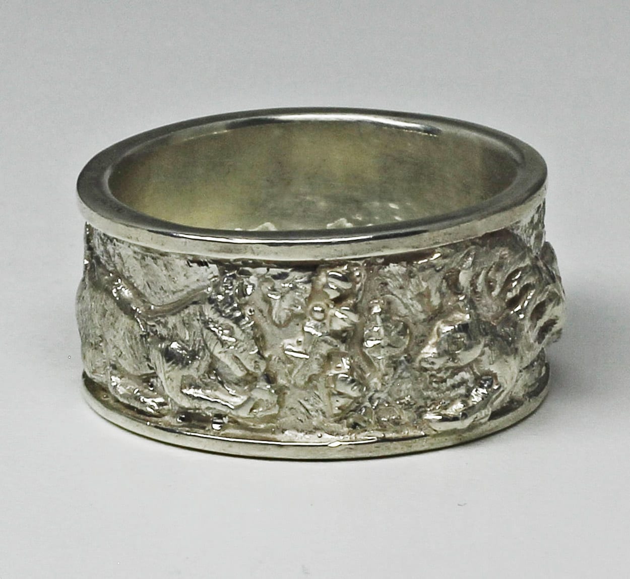 This band is in bright silver. It will oxidize in time and its details will become more defined. Suzan will also oxidize it for you and you can specify as to whether you would like a lighter or heavier ( darker ) finish. This will occur naturally, it can be controlled by lightly rubbing the detail that you want bright with a soft clean cloth from time to time. The recessed areas will darken while the raised parts of the design will stay bright. The ring is hand made in Sterling silver. The ring is a size 8 3/16 in size.