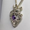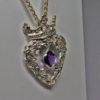 Highland Heart Scottish Luckenbooth, a Scottish silver luckenbooth Designed and hand made by Suzan Postgate. She inscribed the back of the pendant/brooch with a quote from Robert Burns: "My heart is in the highlands." An amethyst is set in the center of the heart which she formed out of silver ribbons and thistles. The amethyst is held in place by thistles, the heart is topped with a crown that is set with a small diamond cut quartz. Suzan has added a pin-back to the luckenbooth so that it can be worn as a pendant or as a brooch.
