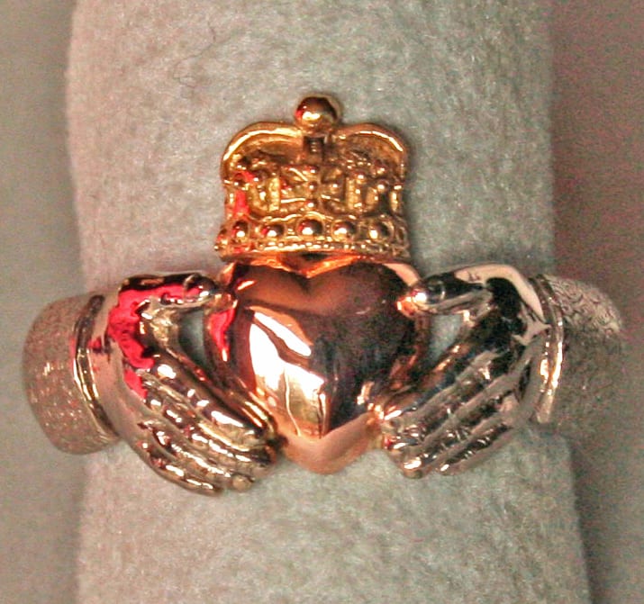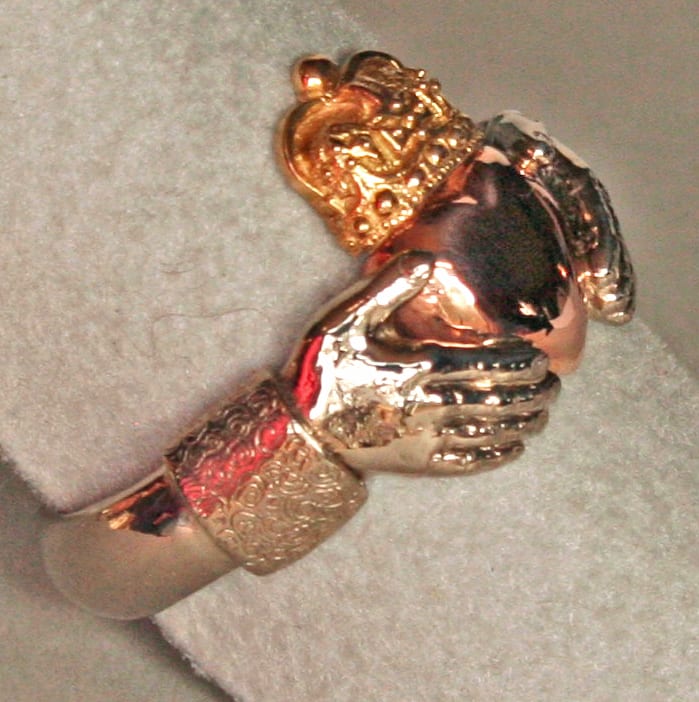 Irish Claddagh Gold Ring, In white, yellow, and pink gold, original design, by George. size 9 1/2
