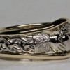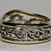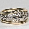 This ring has a 14K yellow Claddagh design and open knot-work center for it’s band. Borders of white 14D ( White 14K palladium gold ) surround the yellow gold center detail. A stone can be set into the heart or a stone that is heart shaped can even replace it. This ring is available in your choice of 14K to 22K gold in one, two, or three colors. This ring is also much heavier than most, and is made to last a lifetime. Click here to see some of the things we’ve made for customers and learn about ordering something special as well: https://postgatejewelers.com/special-order-jewelry/