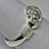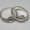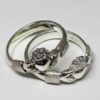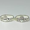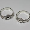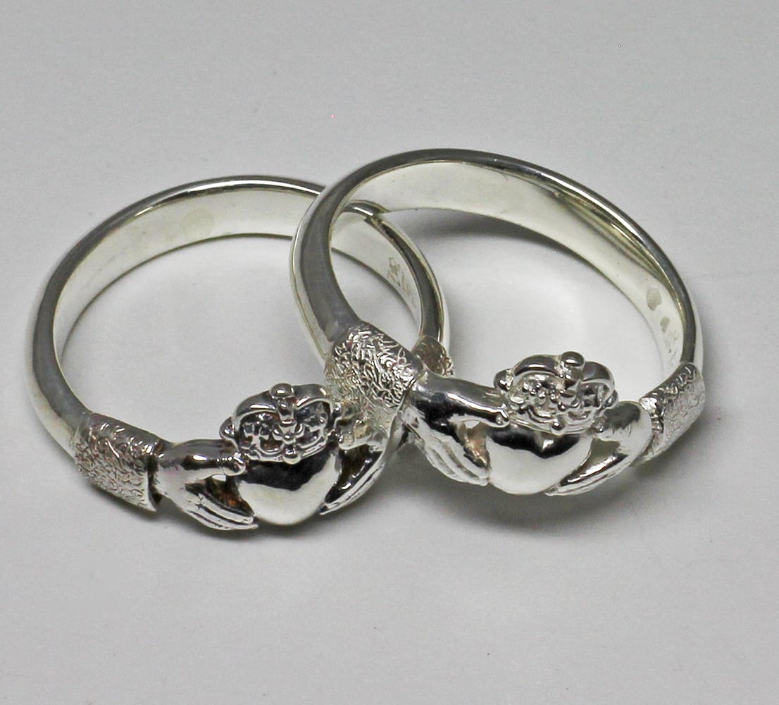 Our Irish silver woman's Claddagh rings were designed and hand made in Sterling silver by George Postgate. They are shown in both bright, and oxidized, finishes so that you can see the difference directly. The brightly finished ring will also oxidize in time, but if you want the darker finish from the start just let us know. While the rings are finely sculpted, they are also nice and heavy, so that they will last a lifetime with normal wear. They are 10 mm tall and both are size 8.