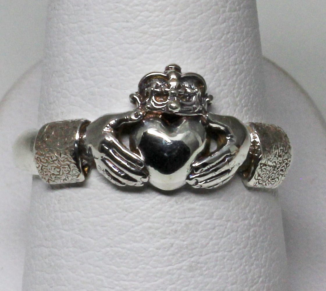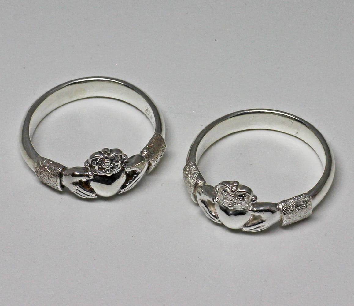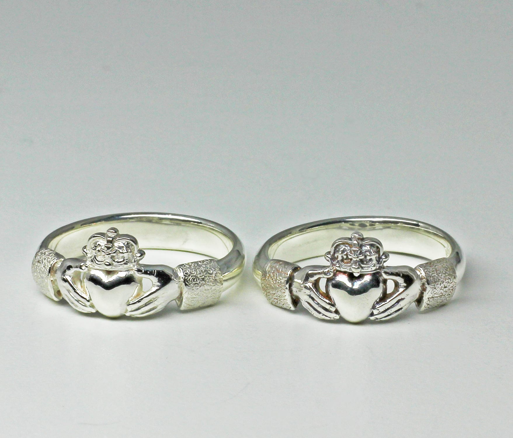 Irish silver woman's Claddagh rings by George, size 8 shown in oxidized and bright finishes.