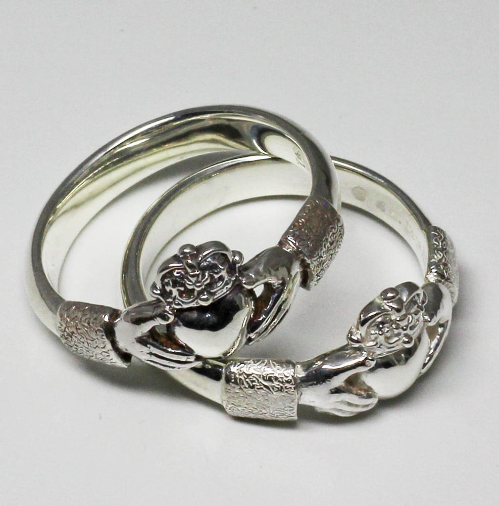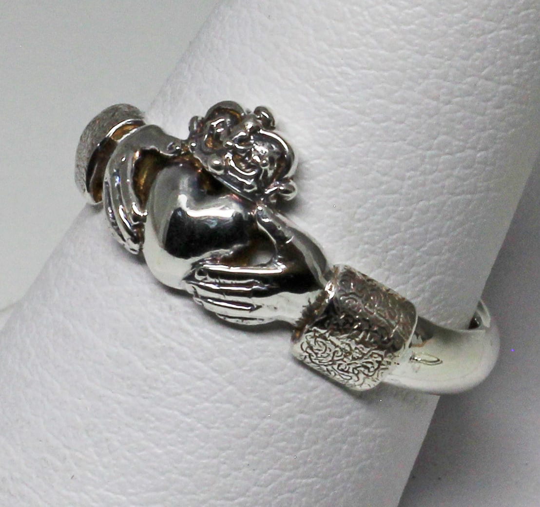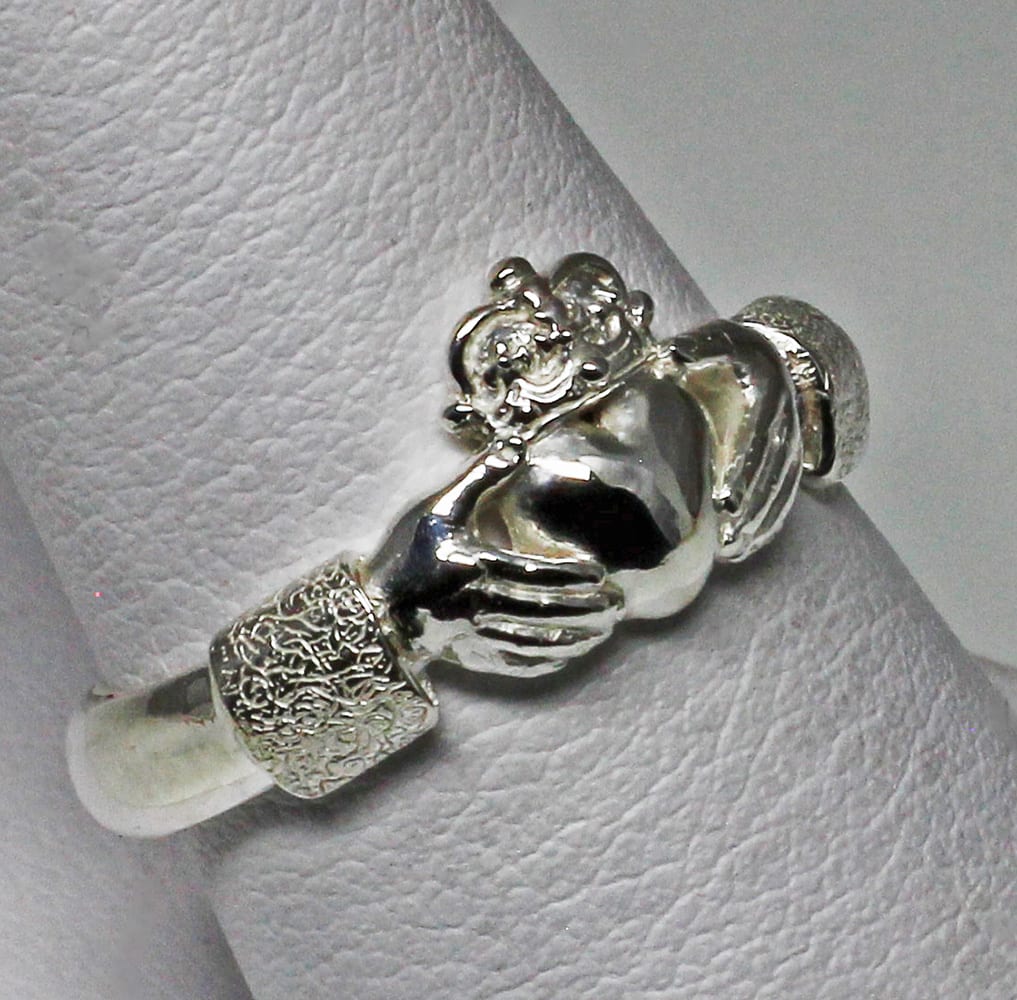 Irish silver woman's Claddagh rings by George, size 8 shown in oxidized and bright finishes.
