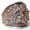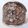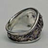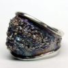 This large Scottish Greenman ring is made of sterling silver. The ring was designed and made by Suzan. The featured ring has a blue green, purple patina, and its edges are brightly polished silver.