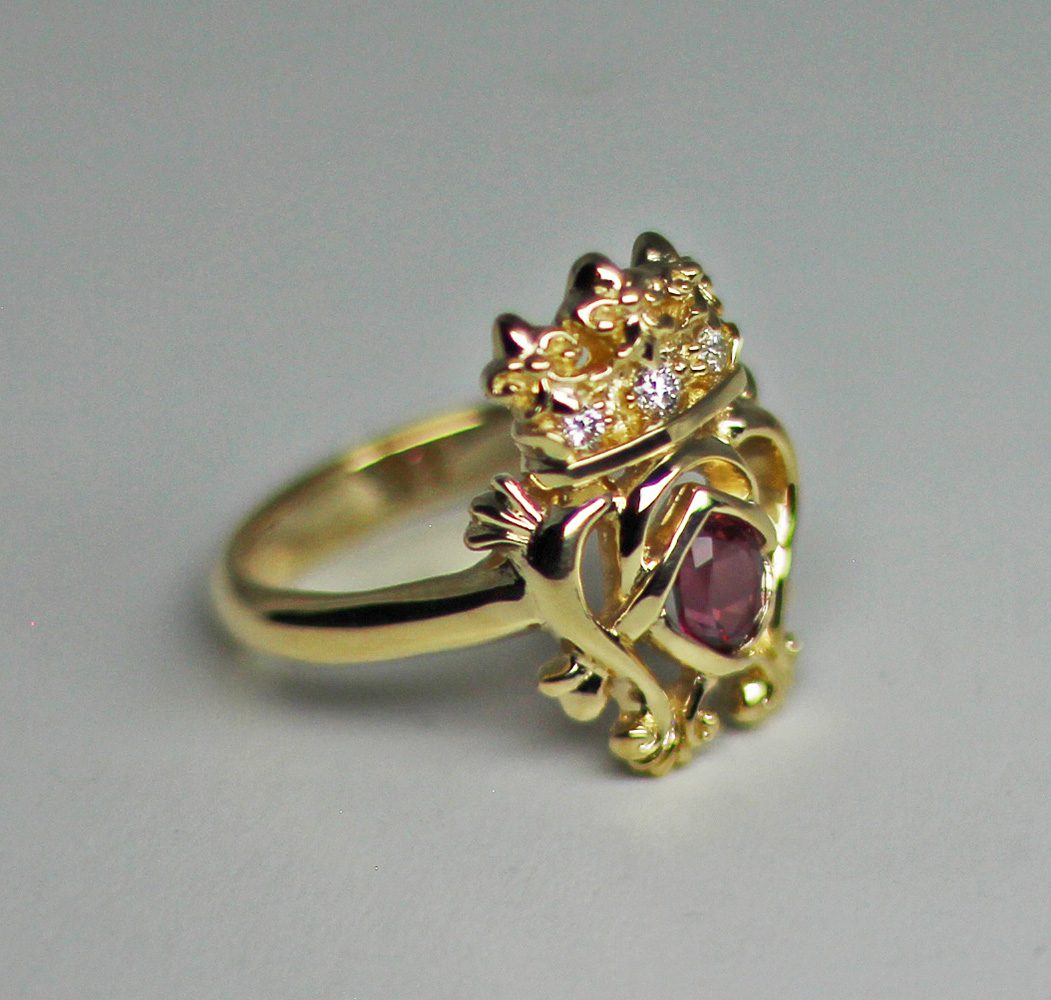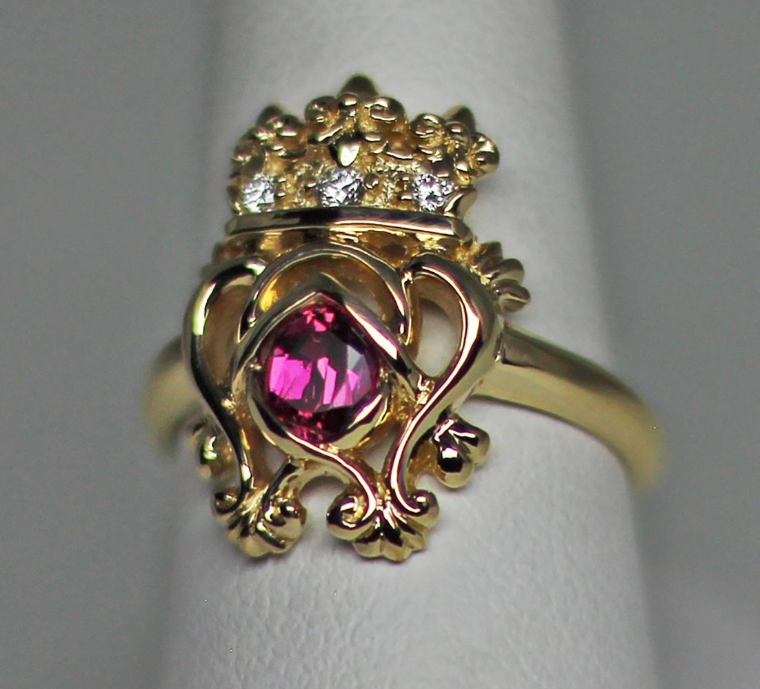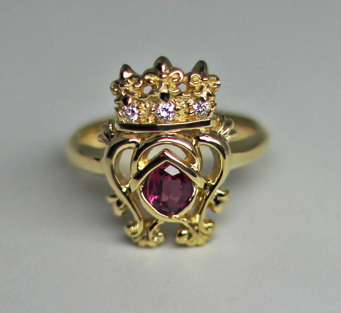 Luckenbooth Ruby 18K ring, designed and made by George Postgate. The ring is a Scottish luckenbooth design. It is set with three diamonds in its crown. A faceted oval ruby is set in the linked heart design under the crown. The ring is made of 18k yellow gold and is hand made. If you love Scottish jewelry please click this link to see more of our Scottish creations. https://postgatejewelers.com/product-category/scottish-jewelry-irish/
